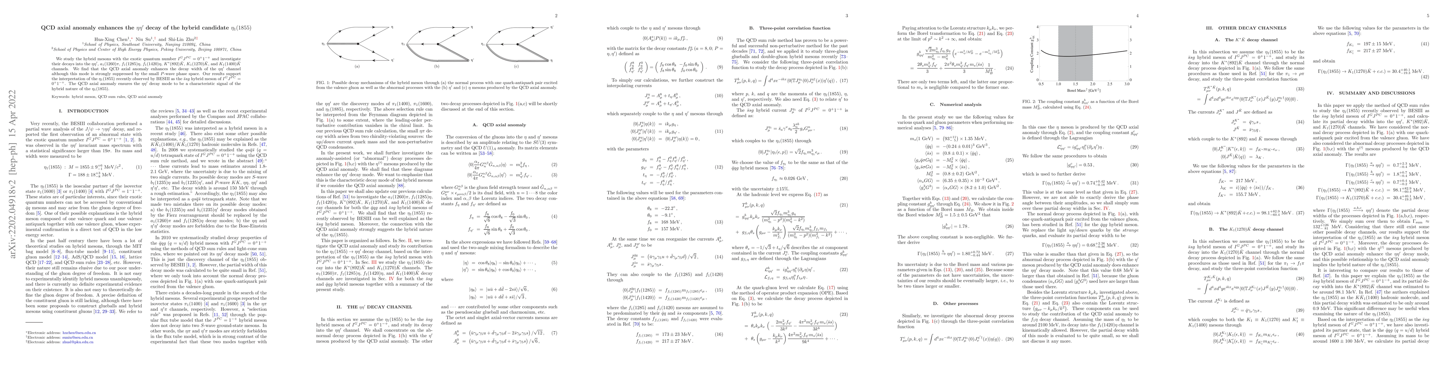 This paper investigates the decay modes of the hybrid meson $\eta_1(1855)$ and finds that the QCD axial anomaly significantly enhances its decay into $\eta \eta^\prime$ despite the small $P$-wave phase space, supporting its identification as a $\bar s s g$ hybrid meson.