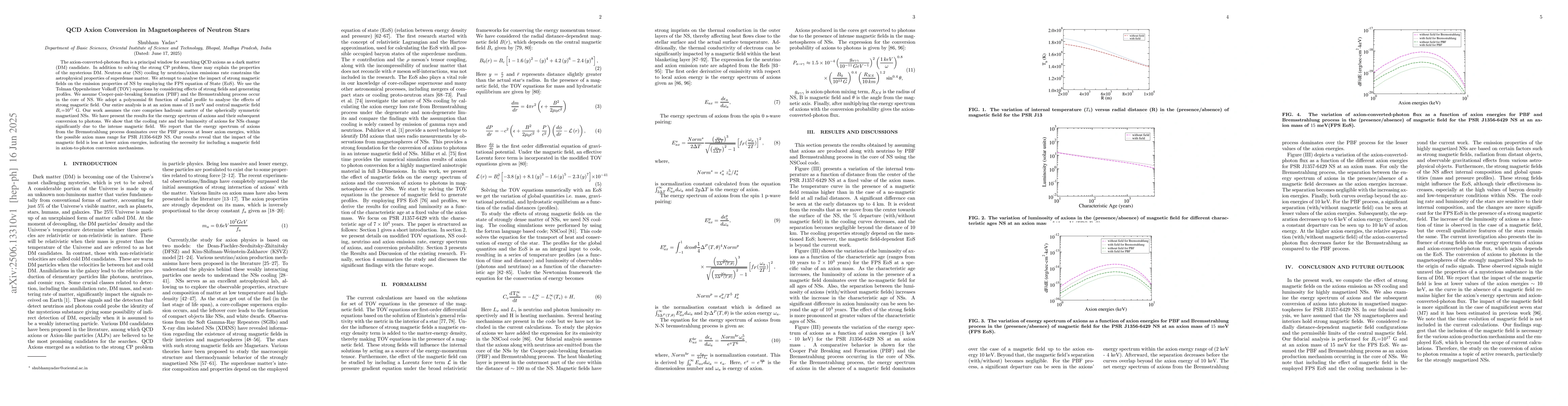 The axion-converted-photons flux is a principal window for searching QCD axions as a dark matter (DM) candidate. In addition to solving the strong CP problem, these may explain the properties of the mysterious DM. Neutron star (NS) cooling by neutrino/axion emissions rate constrains the astrophysical properties of superdense matter. We attempt to analyse the impact of strong magnetic fields on the emission properties of NS by employing the FPS equation of State (EoS). We use the Tolman Oppenheimer Volkoff (TOV) equations by considering effects of strong fields and generating profiles. We assume Cooper-pair-breaking formation (PBF) and the Bremsstrahlung process occur in the core of NS. We adopt a polynomial fit function of radial profile to analyse the effects of strong magnetic field. Our entire analysis is at an axion mass of $15$ meV and central magnetic field $B_{c}$=$10^{17}$ G. Our work assumes the core comprises hadronic matter of the spherically symmetric magnetized NSs. We have present the results for the energy spectrum of axions and their subsequent conversion to photons. We show that the cooling rate and the luminosity of axions for NSs change significantly due to the intense magnetic field. We report that the energy spectrum of axions from the Bremsstrahlung process dominates over the PBF process at lesser axion energies, within the possible axion mass range for PSR J1356-6429 NS. Our results reveal that the impact of the magnetic field is less at lower axion energies, indicating the necessity for including a magnetic field in axion-to-photon conversion mechanisms.