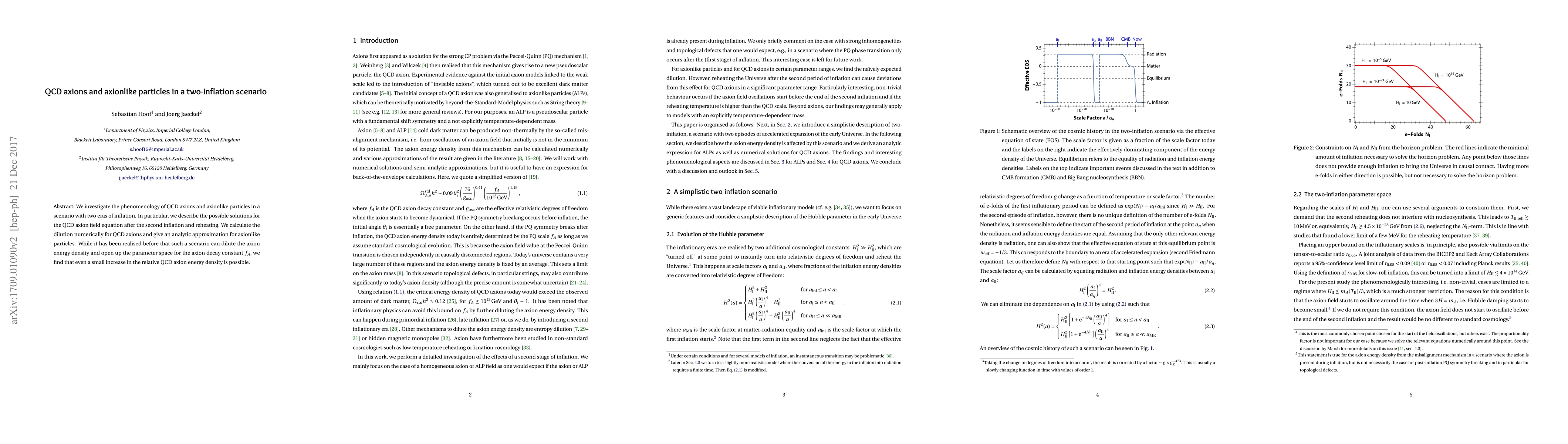 The paper examines QCD axions and axionlike particles in a two-inflation model, detailing their field equations post-second inflation and reheating. It provides numerical dilution calculations for QCD axions and an analytic approximation for axionlike particles, revealing potential small increases in the QCD axion energy density despite dilution.