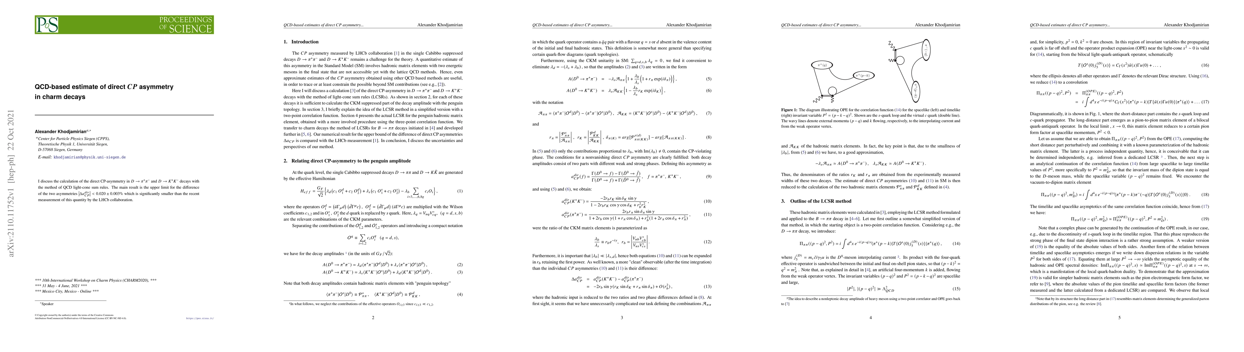 I discuss the calculation of the direct CP-asymmetry in $D\to \pi^+\pi^-$ and $D\to K^+K^- $ decays with the method of QCD light-cone sum rules. The main result is the upper limit for the difference of the two asymmetries $\left|\Delta a_{CP}^{dir}\right| < 0.020\pm 0.003\%$ which is significantly smaller than the recent measurement of this quantity by the LHCb collaboration