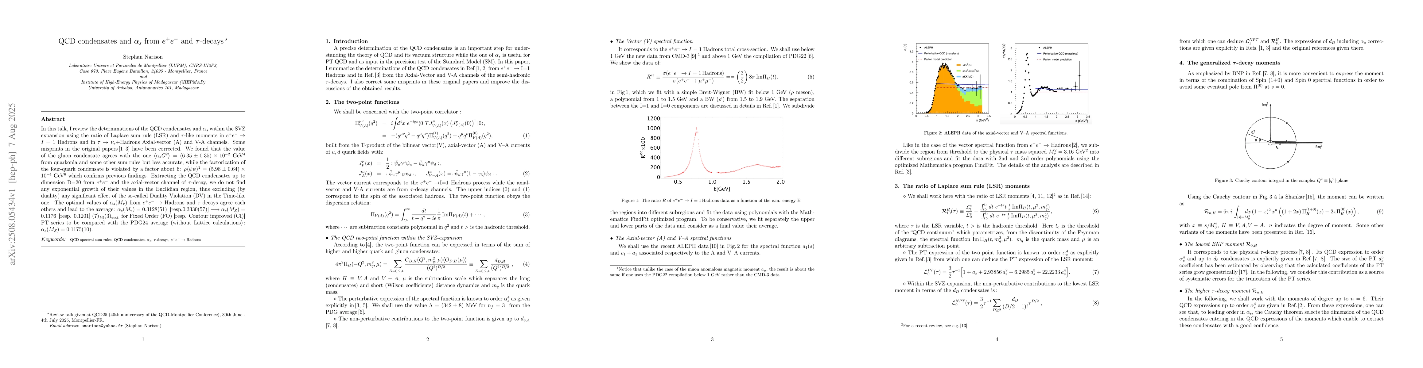 In this talk, I review the determinations of the QCD condensates and $\alpha_s$ within the SVZ expansion using the ratio of Laplace sum rule (LSR) and $\tau$-like moments in $e^+e^-\to I=1$ Hadrons and in $\tau\to \nu_\tau+$Hadrons Axial-vector (A) and V-A channels. Some misprints in the original papers [1-3] have been corrected. We found that the value of the gluon condensate agrees with the one $\langle \alpha_s G^2\rangle=(6.35\pm 0.35)\times 10^{-2}$ GeV$^4$ from quarkonia and some other sum rules but less accurate, while the factorization of the four-quark condensate is violated by a factor about 6: $\rho\langle\bar\psi\psi\rangle^2=(5.98\pm 0.64)\times 10^{-4}$ GeV$^6$ which confirms previous findings. Extracting the QCD condensates up to dimension D=20 from $e^+e^-$ and the axial-vector channel of $\tau$-decay, we do not find any exponential growth of their values in the Euclidian region, thus excluding (by duality) any significant effect of the so-called Duality Violation (DV) in the Time-like one. The optimal values of $\alpha_s(M_\tau)$ from $e^+e^-\to$ Hadrons and $\tau$-decays agree each others and lead to the average: $\alpha_s(M_\tau)=0.3128(51)$ [resp.0.3330(57)] $ \longrightarrow \alpha_s(M_Z) = 0.1176$ [resp. 0.1201] $(7)_{fit}(3)_{evol.}$ for Fixed Order (FO) [resp. Contour improved (CI)] PT series to be compared with the PDG24 average (without Lattice calculations): $ \alpha_s(M_Z) = 0.1175(10)$.