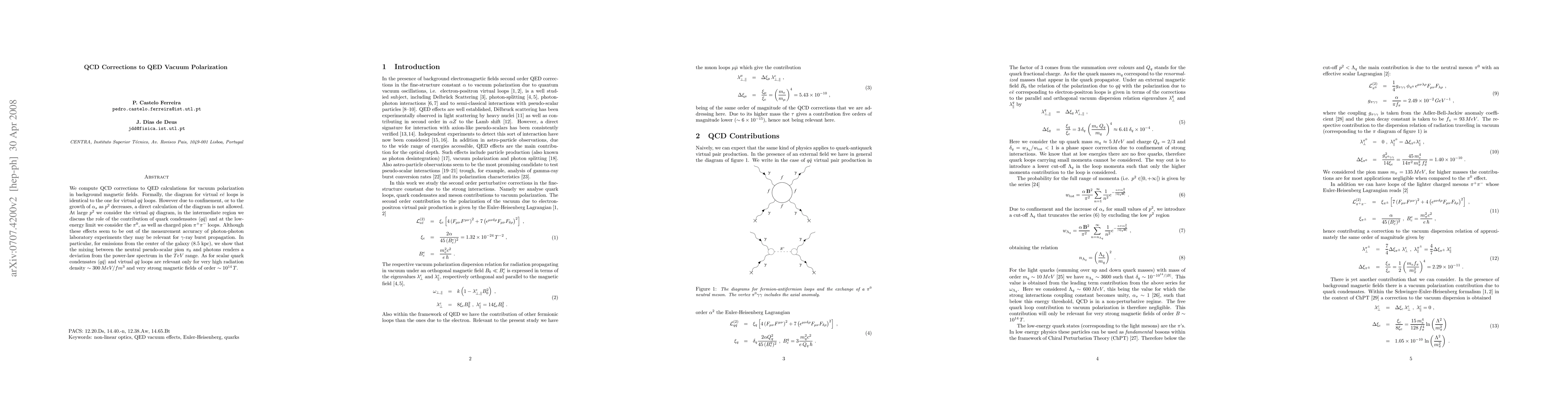 We compute QCD corrections to QED calculations for vacuum polarization in background magnetic fields. Formally, the diagram for virtual $e\bar{e}$ loops is identical to the one for virtual $q\bar{q}$ loops. However due to confinement, or to the growth of $\alpha_s$ as $p^2$ decreases, a direct calculation of the diagram is not allowed. At large $p^2$ we consider the virtual $q\bar{q}$ diagram, in the intermediate region we discuss the role of the contribution of quark condensates $\left< q\bar{q}\right>$ and at the low-energy limit we consider the $\pi^0$, as well as charged pion $\pi^+\pi^-$ loops. Although these effects seem to be out of the measurement accuracy of photon-photon laboratory experiments they may be relevant for $\gamma$-ray burst propagation. In particular, for emissions from the center of the galaxy (8.5 kpc), we show that the mixing between the neutral pseudo-scalar pion $\pi_0$ and photons renders a deviation from the power-law spectrum in the $TeV$ range. As for scalar quark condensates $\left< q\bar{q} right>$ and virtual $q\bar{q}$ loops are relevant only for very high radiation density $\sim 300 MeV/fm^3$ and very strong magnetic fields of order $\sim 10^{14} T$.