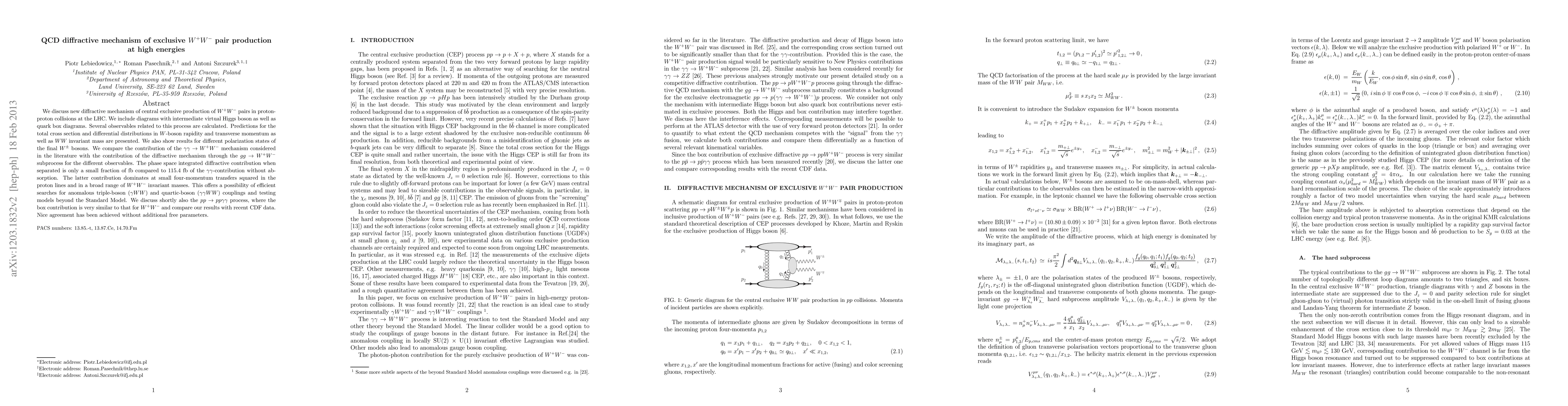 This paper explores a new diffractive mechanism for the exclusive production of $W^+W^-$ pairs in proton-proton collisions at the LHC, including intermediate virtual Higgs and quark box diagrams. It presents predictions for cross sections and distributions, comparing the diffractive mechanism's contribution to the dominant $\gamma\gamma$ mechanism, and discusses potential searches for anomalous couplings beyond the Standard Model.