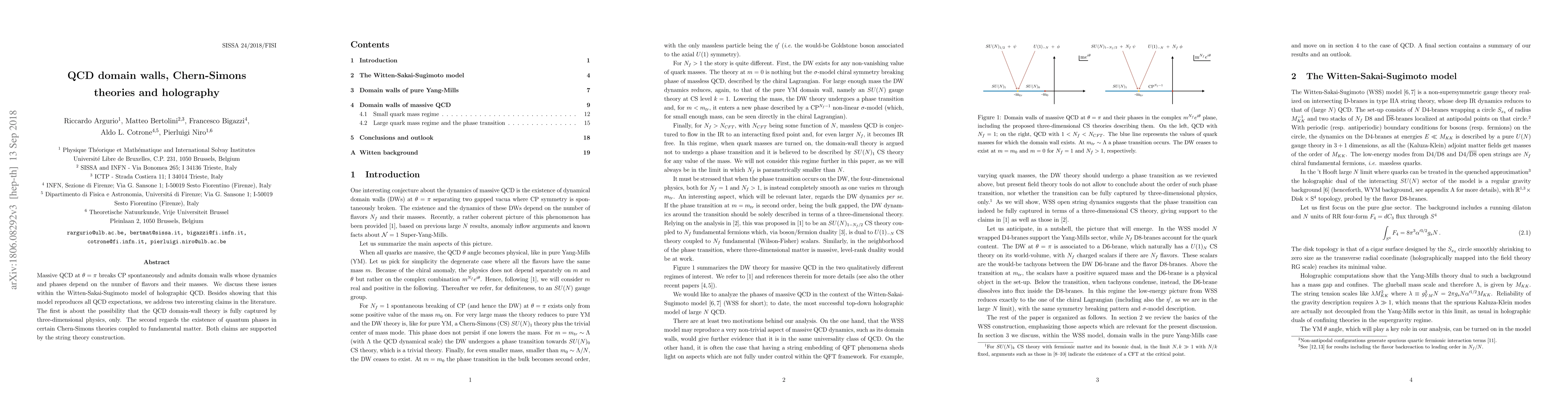 This paper explores massive QCD at $\theta=\pi$ within the Witten-Sakai-Sugimoto model, revealing how CP-symmetry breaking leads to domain walls whose properties vary with flavor numbers and masses. It supports the notion that QCD domain-wall dynamics are three-dimensional and discusses quantum phases in Chern-Simons theories linked to fundamental matter, both substantiated by string theory.
