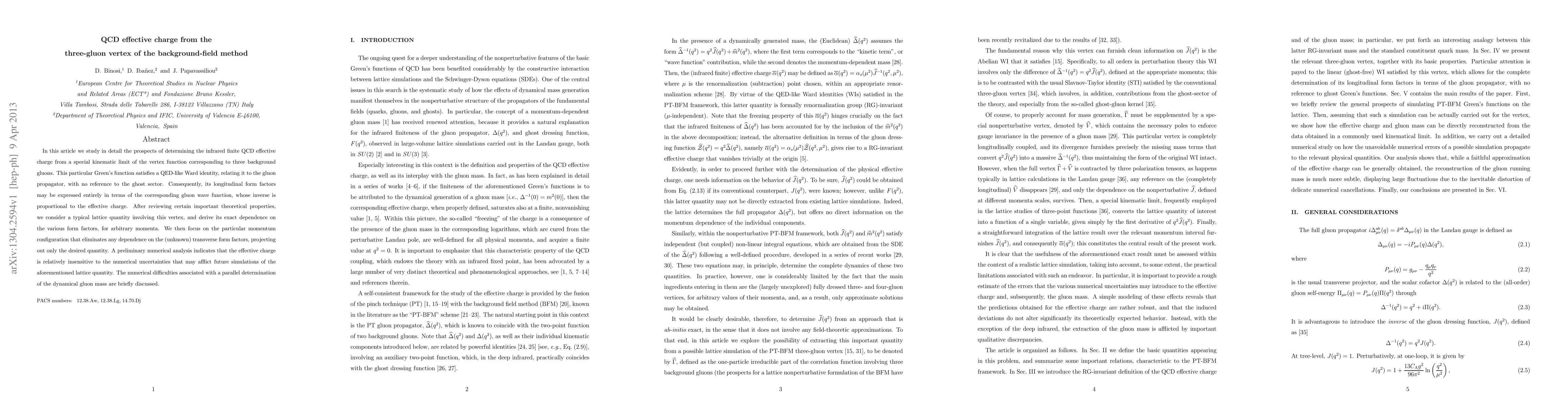 In this article we study in detail the prospects of determining the infrared finite QCD effective charge from a special kinematic limit of the vertex function corresponding to three background gluons. This particular Green's function satisfies a QED-like Ward identity, relating it to the gluon propagator, with no reference to the ghost sector. Consequently, its longitudinal form factors may be expressed entirely in terms of the corresponding gluon wave function, whose inverse is proportional to the effective charge. After reviewing certain important theoretical properties, we consider a typical lattice quantity involving this vertex, and derive its exact dependence on the various form factors, for arbitrary momenta. We then focus on the particular momentum configuration that eliminates any dependence on the (unknown) transverse form factors, projecting out only the desired quantity. A preliminary numerical analysis indicates that the effective charge is relatively insensitive to the numerical uncertainties that may afflict future simulations of the aforementioned lattice quantity. The numerical difficulties associated with a parallel determination of the dynamical gluon mass are briefly discussed.