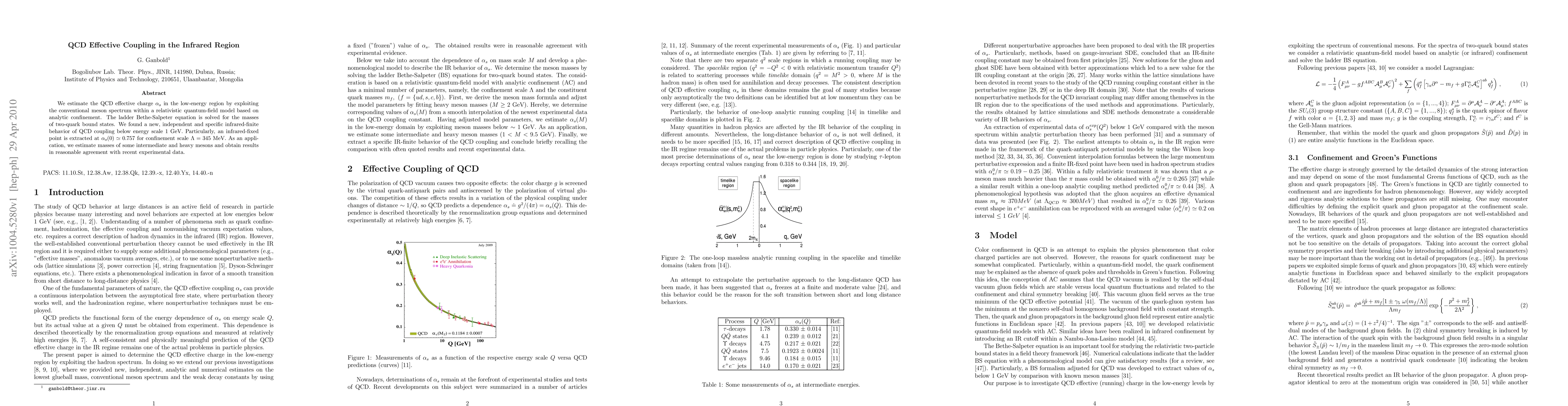 We estimate the QCD effective charge $\alpha_s$ in the low-energy region by exploiting the conventional meson spectrum within a relativistic quantum-field model based on analytic confinement. The ladder Bethe-Salpeter equation is solved for the masses of two-quark bound states. We found a new, independent and specific infrared-finite behavior of QCD coupling below energy scale 1 GeV. Particularly, an infrared-fixed point is extracted at $\alpha_s(0)\simeq 0.757$ for confinement scale $\Lambda=345$ MeV. As an application, we estimate masses of some intermediate and heavy mesons and obtain results in reasonable agreement with recent experimental data.