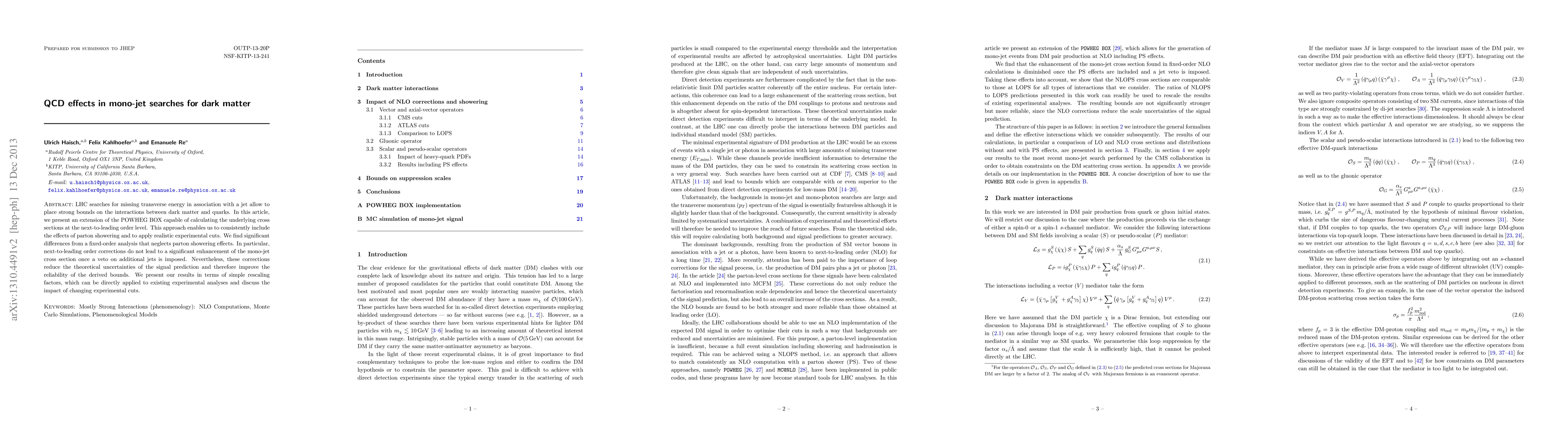 LHC searches for missing transverse energy in association with a jet allow to place strong bounds on the interactions between dark matter and quarks. In this article, we present an extension of the POWHEG BOX capable of calculating the underlying cross sections at the next-to-leading order level. This approach enables us to consistently include the effects of parton showering and to apply realistic experimental cuts. We find significant differences from a fixed-order analysis that neglects parton showering effects. In particular, next-to-leading order corrections do not lead to a significant enhancement of the mono-jet cross section once a veto on additional jets is imposed. Nevertheless, these corrections reduce the theoretical uncertainties of the signal prediction and therefore improve the reliability of the derived bounds. We present our results in terms of simple rescaling factors, which can be directly applied to existing experimental analyses and discuss the impact of changing experimental cuts.