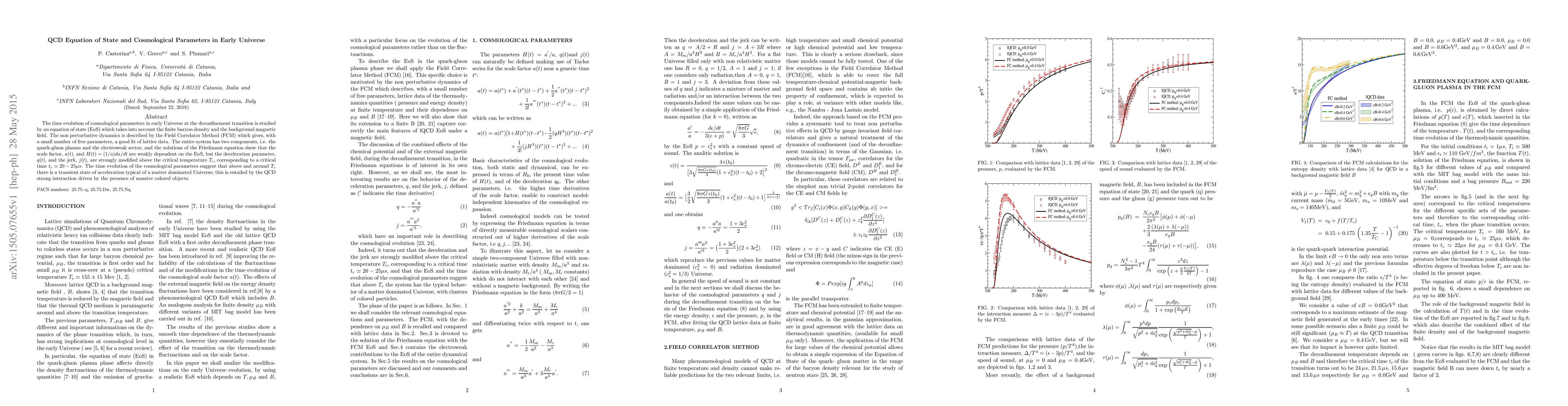 The time evolution of cosmological parameters in early Universe at the deconfinement transition is studied by an equation of state (EoS) which takes into account the finite baryon density and the background magnetic field. The non perturbative dynamics is described by the Field Correlator Method (FCM) which gives, with a small number of free parameters, a good fit of lattice data. The entire system has two components, i.e. the quark-gluon plasma and the electroweak sector, and the solutions of the Friedmann equation show that the scale factor, $a(t)$, and $H(t)= (1/a)da/dt$ are weakly dependent on the EoS, but the deceleration parameter, $q(t)$, and the jerk, $j(t)$, are strongly modified above the critical temperature $T_c$, corresponding to a critical time $t_c \simeq 20-25 \mu s$. The time evolution of the cosmological parameters suggest that above and around $T_c$ there is a transient state of acceleration typical of a matter dominated Universe; this is entailed by the QCD strong interaction driven by the presence of massive colored objects.
