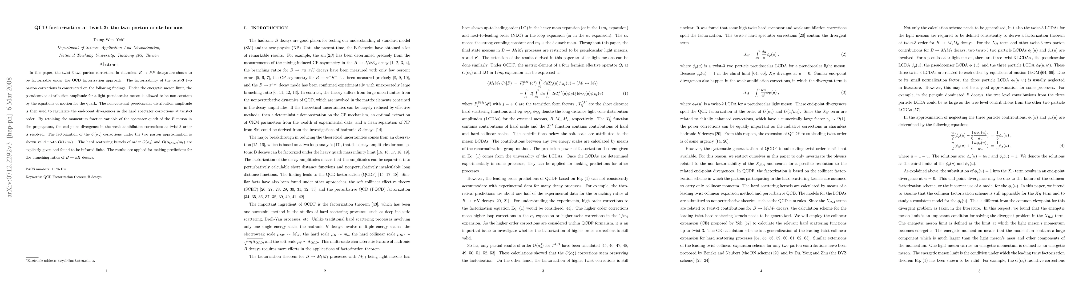 This paper demonstrates the factorization of twist-3 two parton corrections in charmless $B\to PP$ decays under the QCD factorization approach, using a non-constant pseudoscalar distribution amplitude to resolve end-point divergences. The study provides explicit hard scattering kernels and predicts branching ratios for $B\to \pi K$ decays.
