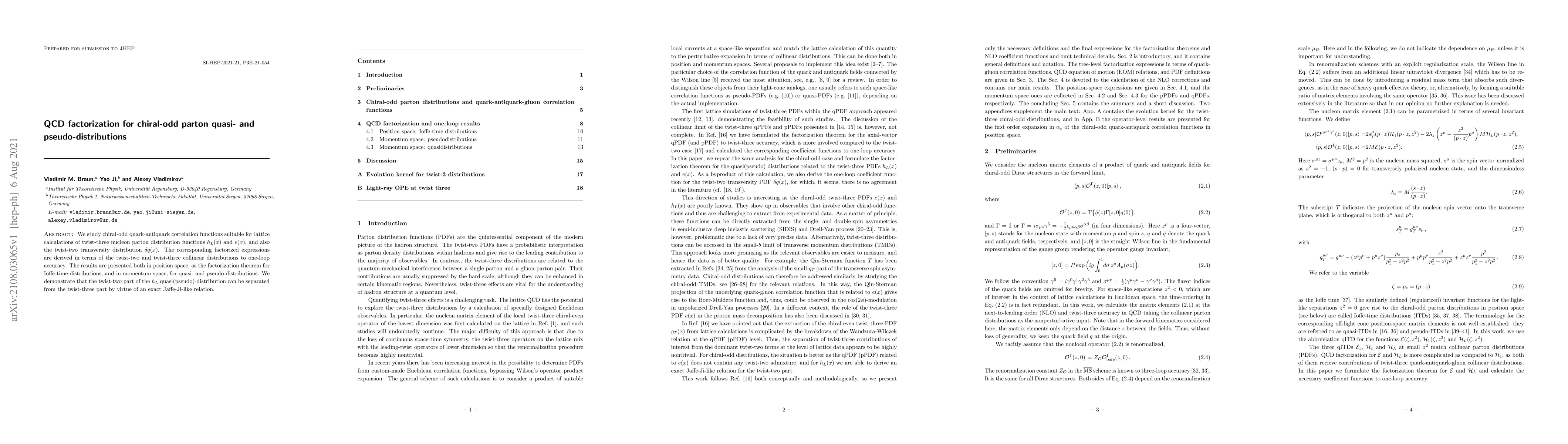 We study chiral-odd quark-antiquark correlation functions suitable for lattice calculations of twist-three nucleon parton distribution functions $h_L(x)$ and $e(x)$, and also the twist-two transversity distribution $\delta q(x)$. The corresponding factorized expressions are derived in terms of the twist-two and twist-three collinear distributions to one-loop accuracy. The results are presented both in position space, as the factorization theorem for Ioffe-time distributions, and in momentum space, for quasi- and pseudo-distributions. We demonstrate that the twist-two part of the $h_L$ quasi(pseudo)-distribution can be separated from the twist-three part by virtue of an exact Jaffe-Ji-like relation.