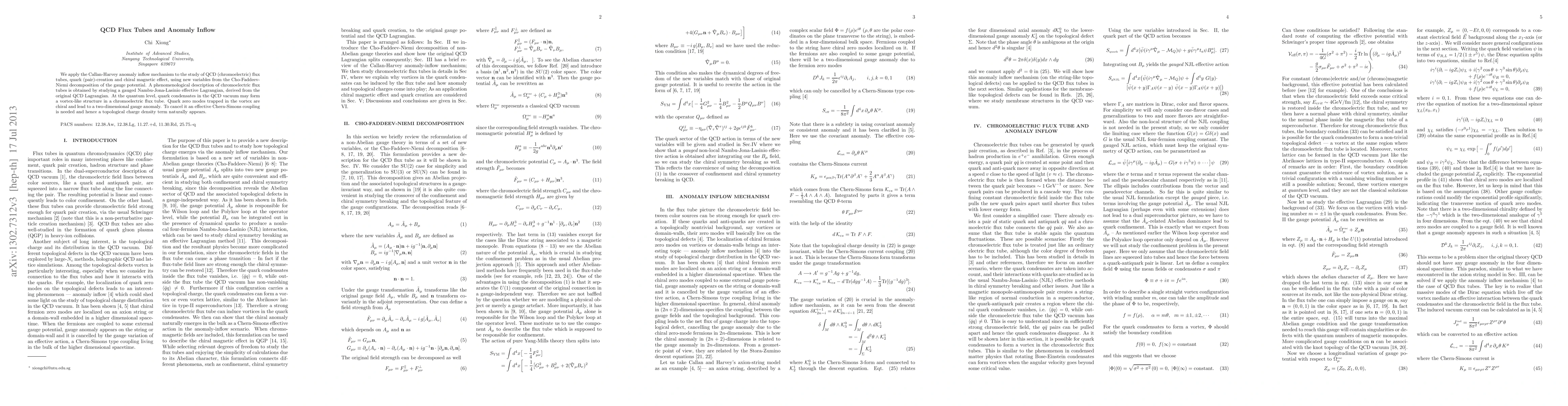 We apply the Callan-Harvey anomaly inflow mechanism to the study of QCD (chromoelectric) flux tubes, quark (pair)-creation and chiral magnetic effect, using new variables from the Cho-Faddeev-Niemi decomposition of the gauge potential. A phenomenological description of chromoelectric flux tubes is obtained by studying a gauged Nambu-Jona-Lasinio effective Lagrangian, derived from the original QCD Lagrangian. At the quantum level, quark condensates in the QCD vacuum may form a vortex-like structure in a chromoelectric flux tube. Quark zero modes trapped in the vortex are chiral and lead to a two-dimensional gauge anomaly. To cancel it an effective Chern-Simons coupling is needed and hence a topological charge density term naturally appears.