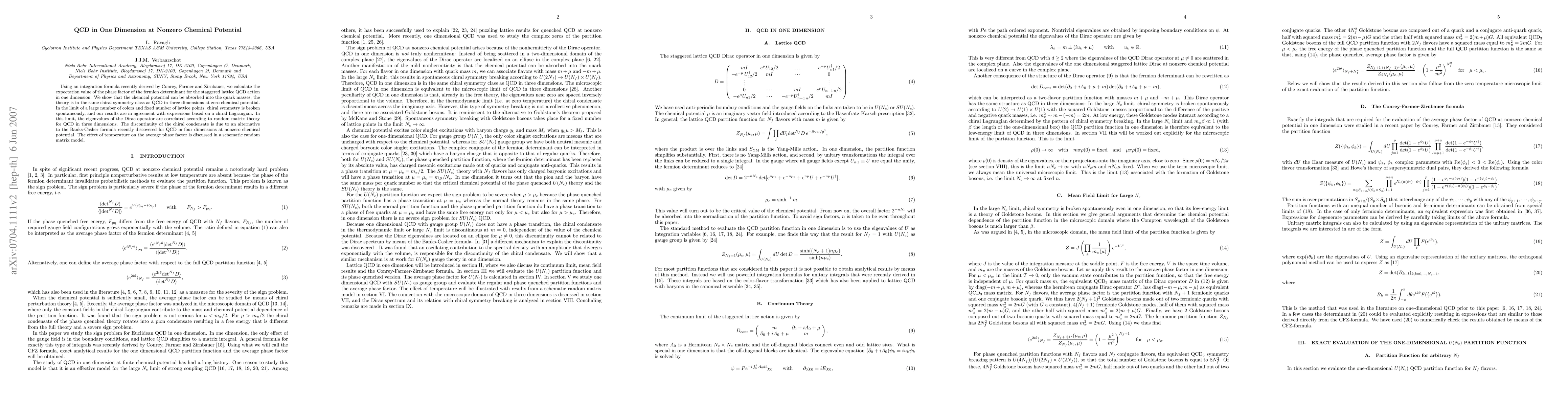 Using an integration formula recently derived by Conrey, Farmer and Zirnbauer, we calculate the expectation value of the phase factor of the fermion determinant for the staggered lattice QCD action in one dimension. We show that the chemical potential can be absorbed into the quark masses; the theory is in the same chiral symmetry class as QCD in three dimensions at zero chemical potential. In the limit of a large number of colors and fixed number of lattice points, chiral symmetry is broken spontaneously, and our results are in agreement with expressions based on a chiral Lagrangian. In this limit, the eigenvalues of the Dirac operator are correlated according to random matrix theory for QCD in three dimensions. The discontinuity of the chiral condensate is due to an alternative to the Banks-Casher formula recently discovered for QCD in four dimensions at nonzero chemical potential. The effect of temperature on the average phase factor is discussed in a schematic random matrix model.