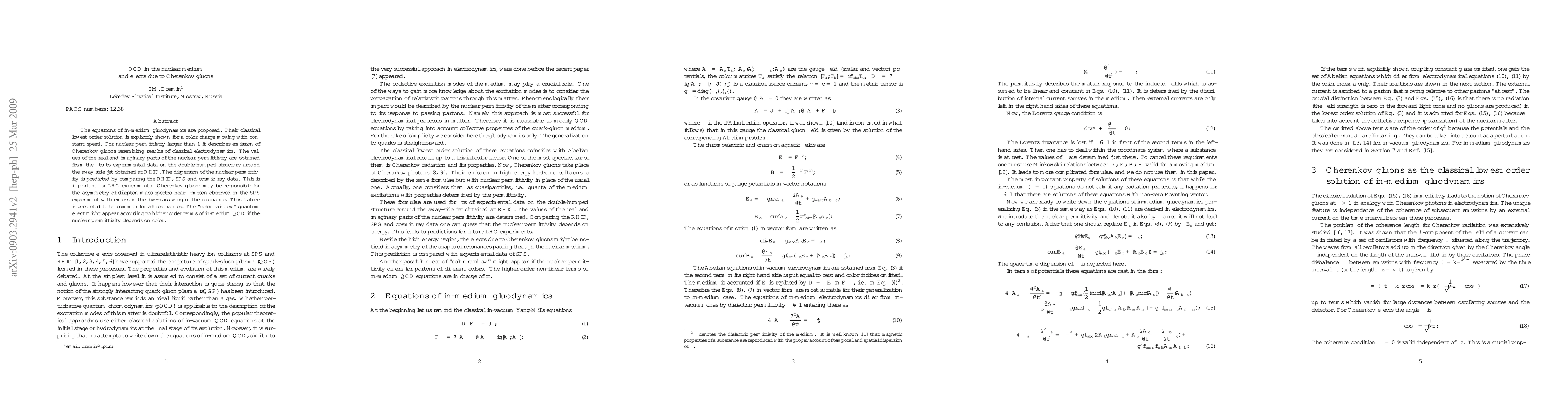 The equations of in-medium gluodynamics are proposed. Their classical lowest order solution is explicitly shown for a color charge moving with constant speed. For nuclear permittivity larger than 1 it describes emission of Cherenkov gluons resembling results of classical electrodynamics. The values of the real and imaginary parts of the nuclear permittivity are obtained from the fits to experimental data on the double-humped structure around the away-side jet obtained at RHIC. The dispersion of the nuclear permittivity is predicted by comparing the RHIC, SPS and cosmic ray data. This is important for LHC experiments. Cherenkov gluons may be responsible for the asymmetry of dilepton mass spectra near rho-meson, observed in the SPS experiment with excess in the low-mass wing of the resonance. This feature is predicted to be common for all resonances. The "color rainbow" quantum effect might appear according to higher order terms of in-medium QCD if the nuclear permittivity depends on color.
