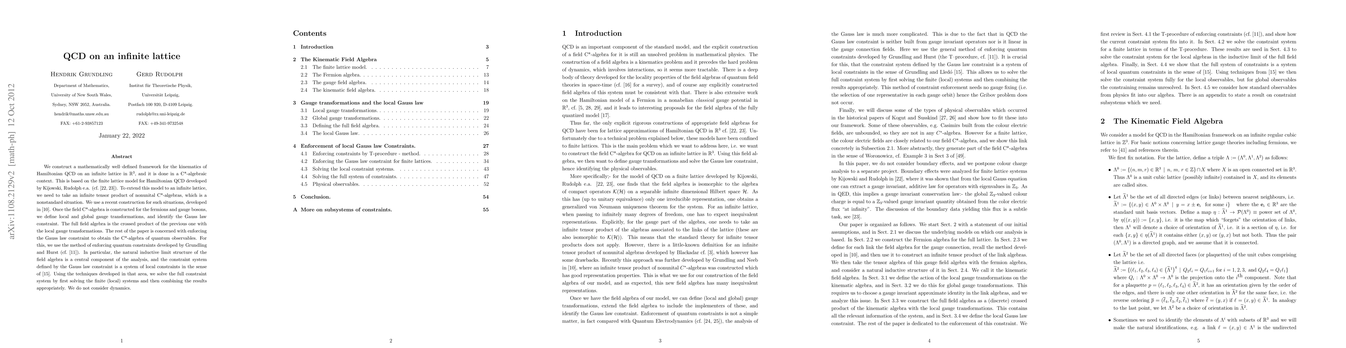 We construct a mathematically well--defined framework for the kinematics of Hamiltonian QCD on an infinite lattice in $\R^3$, and it is done in a C*-algebraic context. This is based on the finite lattice model for Hamiltonian QCD developed by Kijowski, Rudolph e.a.. To extend this model to an infinite lattice, we need to take an infinite tensor product of nonunital C*-algebras, which is a nonstandard situation. We use a recent construction for such situations, developed by Grundling and Neeb. Once the field C*-algebra is constructed for the fermions and gauge bosons, we define local and global gauge transformations, and identify the Gauss law constraint. The full field algebra is the crossed product of the previous one with the local gauge transformations. The rest of the paper is concerned with enforcing the Gauss law constraint to obtain the C*-algebra of quantum observables. For this, we use the method of enforcing quantum constraints developed by Grundling and Hurst. In particular, the natural inductive limit structure of the field algebra is a central component of the analysis, and the constraint system defined by the Gauss law constraint is a system of local constraints in the sense of Grundling and Lledo. Using the techniques developed in that area, we solve the full constraint system by first solving the finite (local) systems and then combining the results appropriately. We do not consider dynamics.