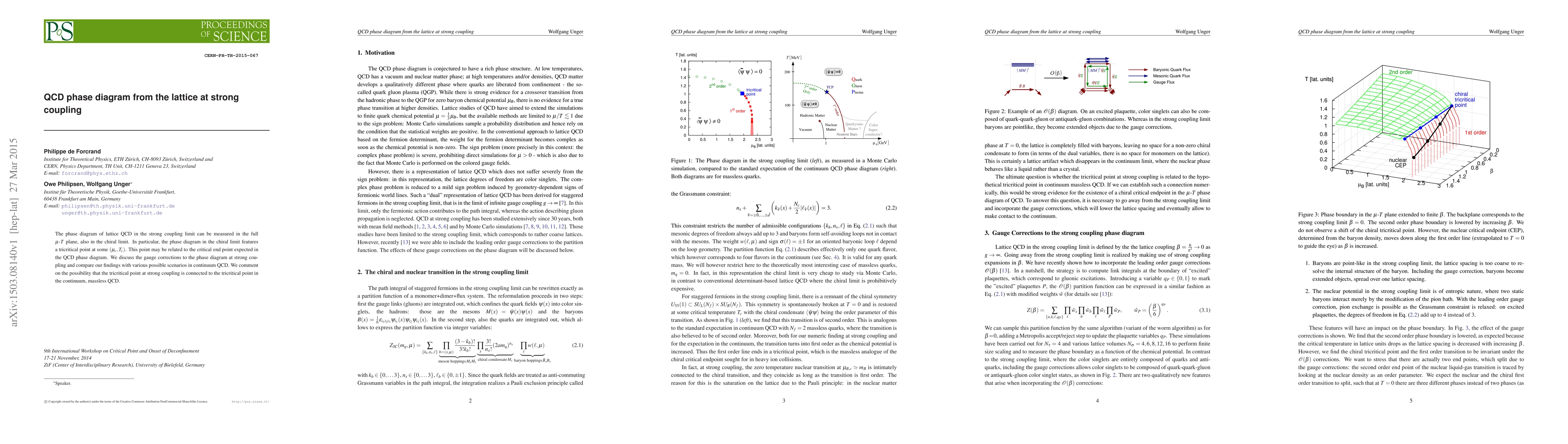 The phase diagram of lattice QCD in the strong coupling limit can be measured in the full $\mu$-$T$ plane, also in the chiral limit. In particular, the phase diagram in the chiral limit features a tricritical point at some $(\mu_c,T_c)$. This point may be related to the critical end point expected in the QCD phase diagram. We discuss the gauge corrections to the phase diagram at strong coupling and compare our findings with various possible scenarios in continuum QCD. We comment on the possibility that the tricritical point at strong coupling is connected to the tricritical point in the continuum, massless QCD.