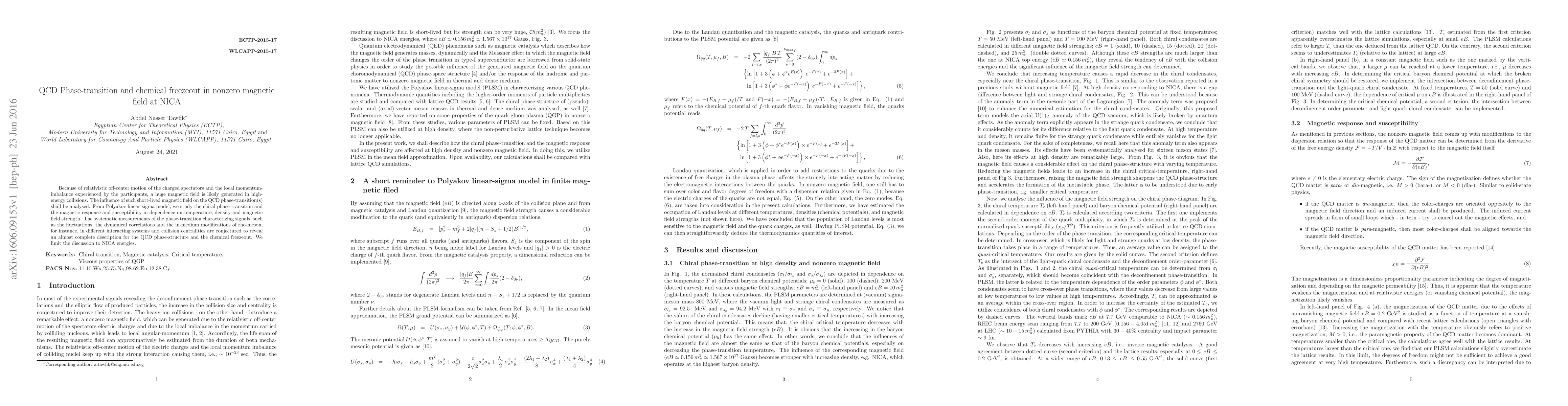 Because of relativistic off-center motion of the charged spectators and the local momentum-imbalance experienced by the participants, a huge magnetic field is likely generated in high-energy collisions. The influence of such short-lived magnetic field on the QCD phase-transition(s) shall be analysed. From Polyakov linear-sigma model, we study the chiral phase-transition and the magnetic response and susceptibility in dependence on temperature, density and magnetic field strength. The systematic measurements of the phase-transition characterizing signals, such as the fluctuations, the dynamical correlations and the in-medium modifications of rho-meson, for instance, in different interacting systems and collision centralities are conjectured to reveal an almost complete description for the QCD phase-structure and the chemical freezeout. We limit the discussion to NICA energies.