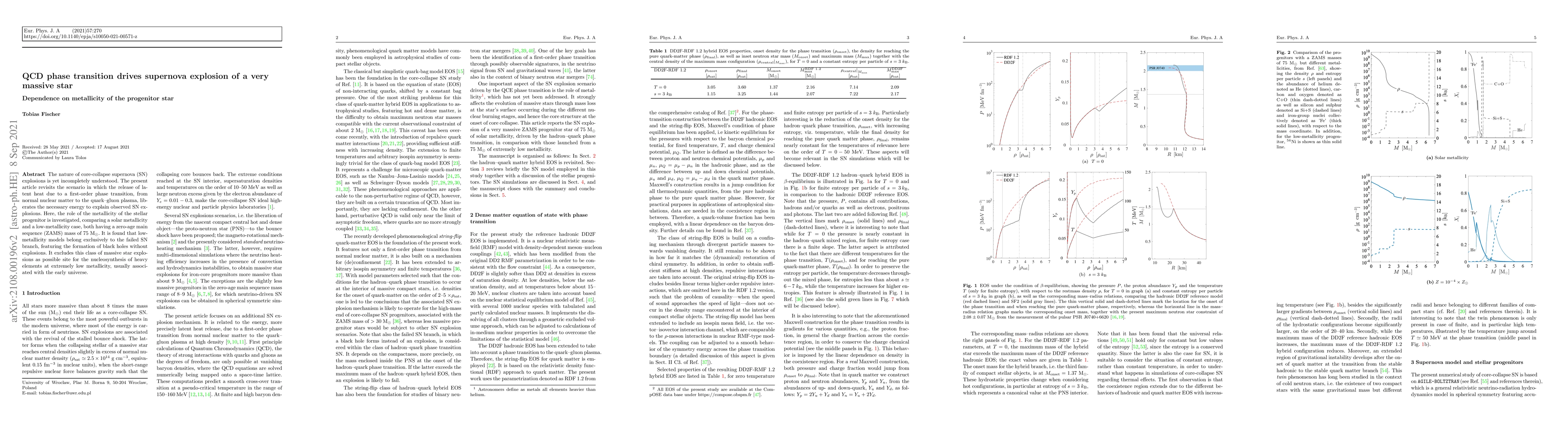 The nature of core-collapse supernova (SN) explosions is yet incompletely understood. The present article revisits the scenario in which the release of latent heat due to a first-order phase transition, from normal nuclear matter to the quark-gluon plasma, liberates the necessary energy to explain observed SN explosions. Here, the role of the metallicity of the stellar progenitor is investigated, comparing a solar metallicity and a low-metallicity case, both having a zero-age main sequence (ZAMS) mass of 75 $M_\odot$. It is found that low-metallicity models belong exclusively to the failed SN branch, featuring the formation of black holes without explosions. It excludes this class of massive star explosions as possible site for the nucleosynthesis of heavy elements at extremely low metallicity, usually associated with the early universe.