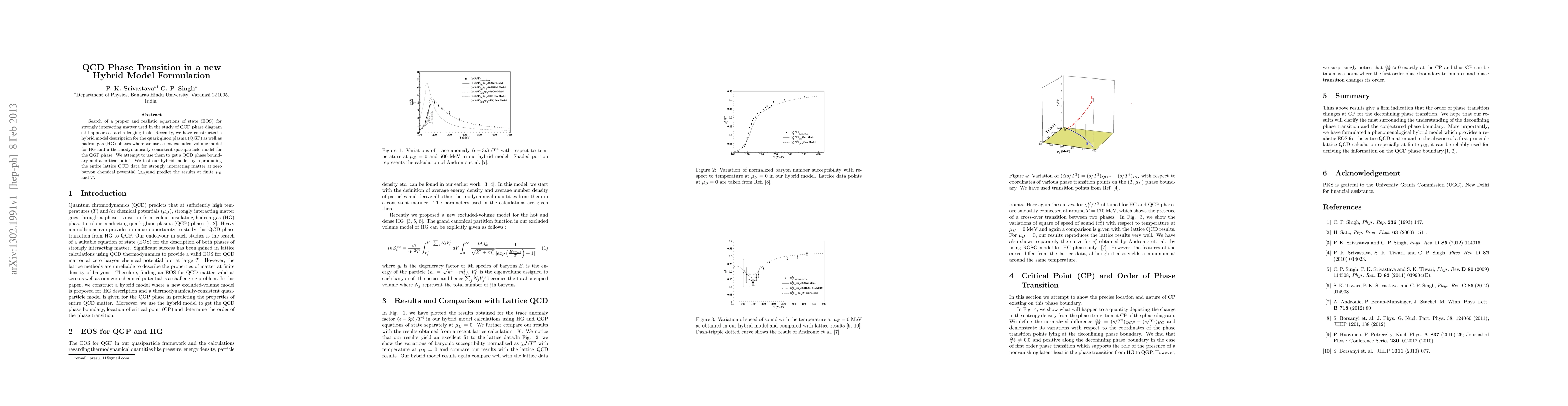 Search of a proper and realistic equations of state (EOS) for strongly interacting matter used in the study of QCD phase diagram still appears as a challenging task. Recently, we have constructed a hybrid model description for the quark gluon plasma (QGP) as well as hadron gas (HG) phases where we use a new excluded-volume model for HG and a thermodynamically-consistent quasiparticle model for the QGP phase. We attempt to use them to get a QCD phase boundary and a critical point. We test our hybrid model by reproducing the entire lattice QCD data for strongly interacting matter at zero baryon chemical potential ($\mu_{B}$)and predict the results at finite $\mu_{B}$ and $T$.