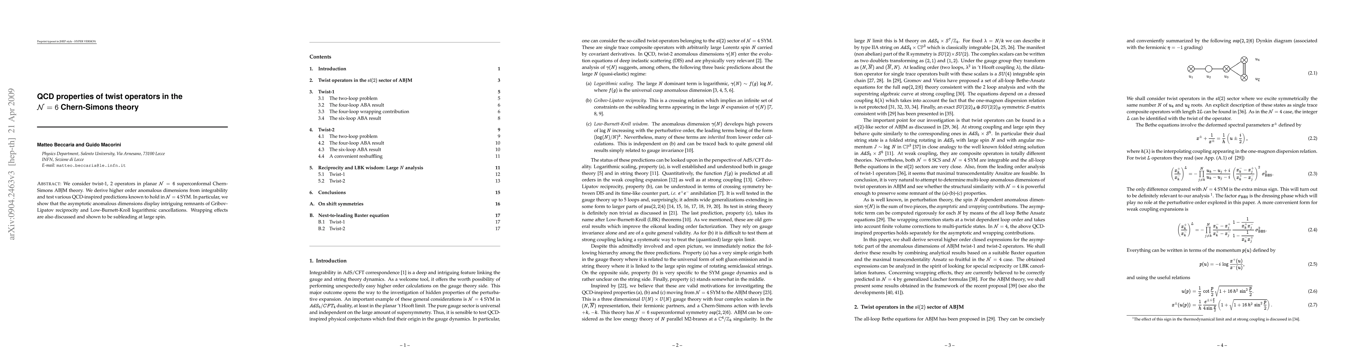 This paper investigates twist-1 and twist-2 operators in N=6 Chern-Simons theory, deriving higher order anomalous dimensions through integrability and testing QCD-inspired predictions. It finds that asymptotic dimensions exhibit features like Gribov-Lipatov reciprocity and Low-Burnett-Kroll cancellations, while wrapping effects are shown to be subleading at large spin.