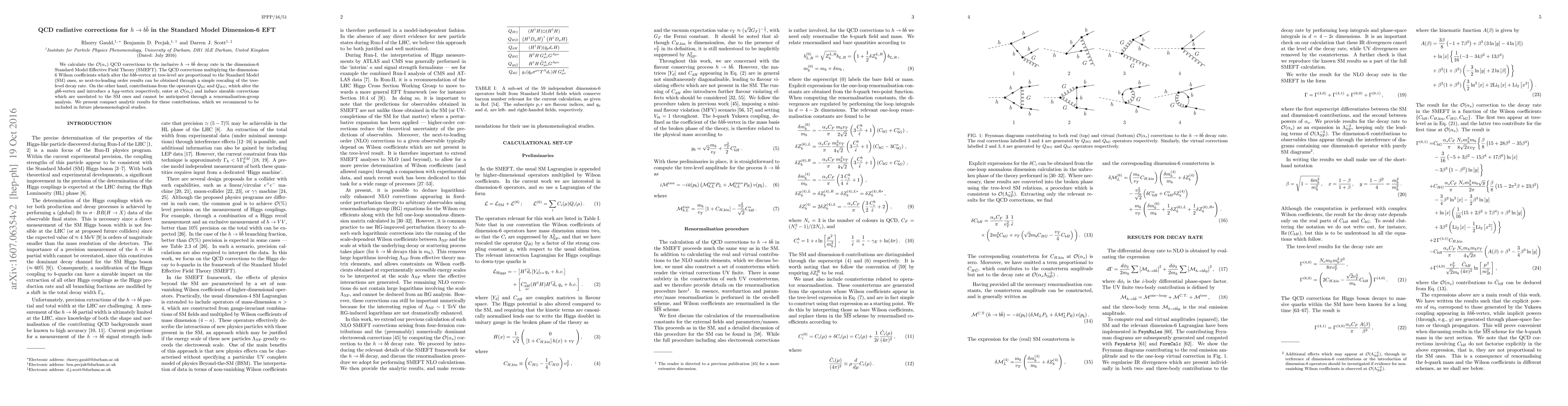 The research calculates $\mathcal{O}(\alpha_s)$ QCD corrections to the inclusive $h\to b\bar b$ decay rate in the dimension-6 Standard Model Effective Field Theory (SMEFT).