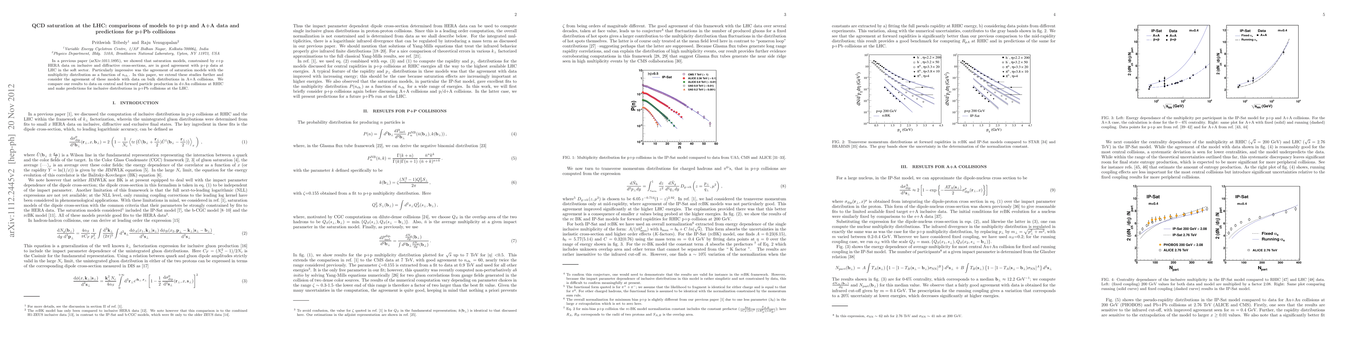 This paper extends previous studies on QCD saturation models, showing their agreement with LHC p+p data, and compares these models against bulk distribution data from A+A collisions, including d+Au at RHIC. It also makes predictions for inclusive distributions in upcoming p+Pb collisions at the LHC.