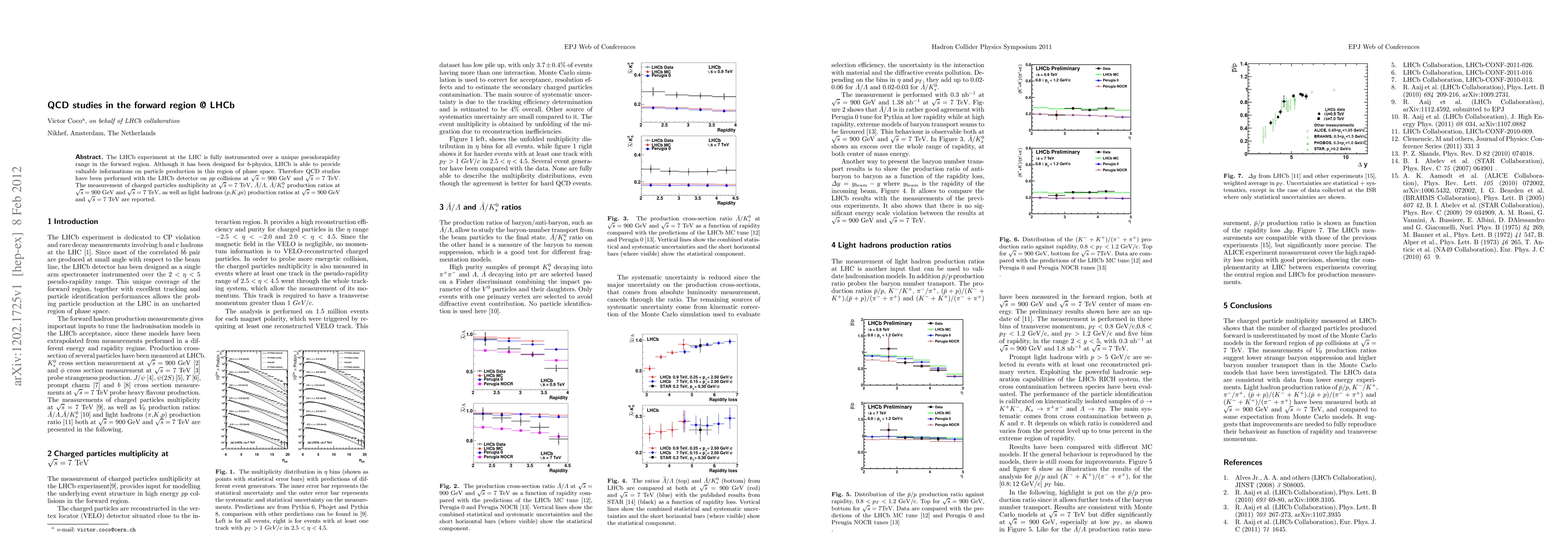 The LHCb experiment at the LHC is fully instrumented over a unique pseudorapidity range in the forward region. Although it has been designed for b-physics, LHCb is able to provide valuable informations on particle production in this region of phase space. Therefore QCD studies have been performed with the LHCb detector on pp collisions at \sqrt(s)=900 GeV and \sqrt(s)=7 TeV. The measurement of charged particles multiplicity at \sqrt{s}=7 TeV}, \bar(Lambda)/Lambda, \bar(Lambda)/K_s^0 production ratios at \sqrt(s)=900 GeV and \sqrt(s)=7 TeV, as well as light hadrons (p,K,pi) production ratios at \sqrt(s)=900 GeV and \sqrt(s)=7 TeV are reported.