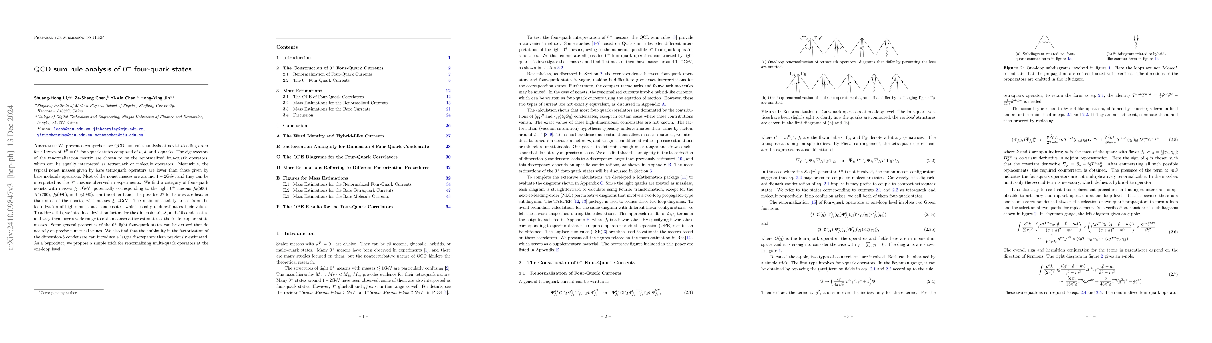 We present a comprehensive QCD sum rules analysis for all types of light $J^P=0^{+}$ four-quark states at next-to-leading order. Most of them have masses around $1-2\text{GeV}$ and can be interpreted as the $0^+$ mesons observed in experiments. We find a category of four-quark nonets with masses $\lesssim1\text{GeV}$, potentially corresponding to the light $0^+$ mesons $f_0(500)$, $K^*_0(700)$, $f_0(980)$ and $a_0(980)$. Additionally, the 27-fold states may also exist, which are heavier than the $0^+$ nonets. The main uncertainty in the results arises from the factorization deviation of the multi-quark condensates. We also find that the factorization of dimension-8 condensates involves an ambiguity larger than $O(1/N_C^2)$. As a byproduct, a simple trick for renormalizing multi-quark operators at one-loop level is proposed in this paper.