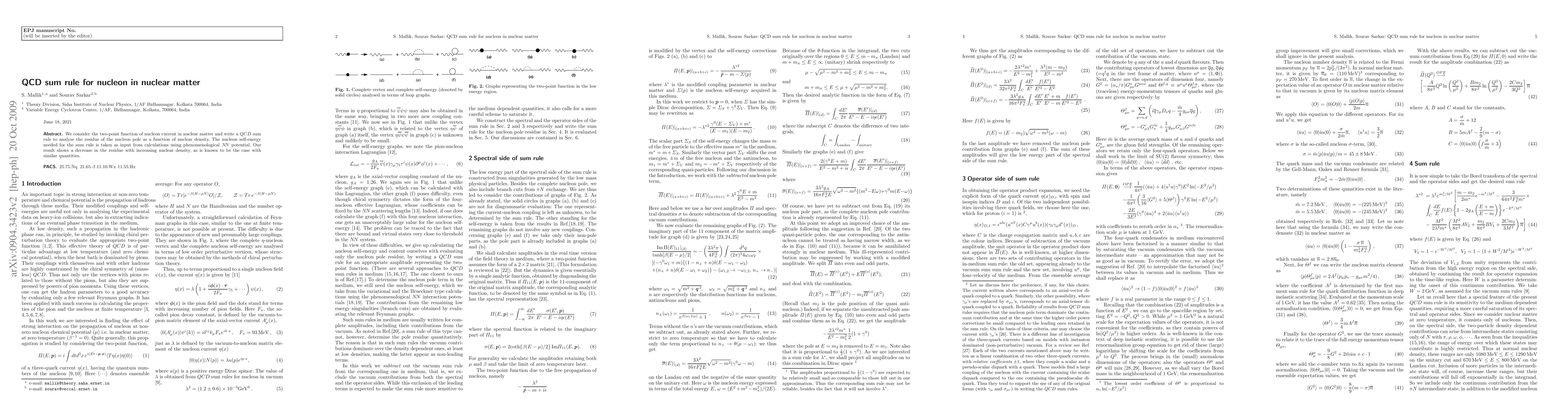 We consider the two-point function of nucleon current in nuclear matter and write a QCD sum rule to analyse the residue of the nucleon pole as a function of nuclear density. The nucleon self-energy needed for the sum rule is taken as input from calculations using phenomenological NN potential. Our result shows a decrease in the residue with increasing nuclear density, as is known to be the case with similar quantities.
