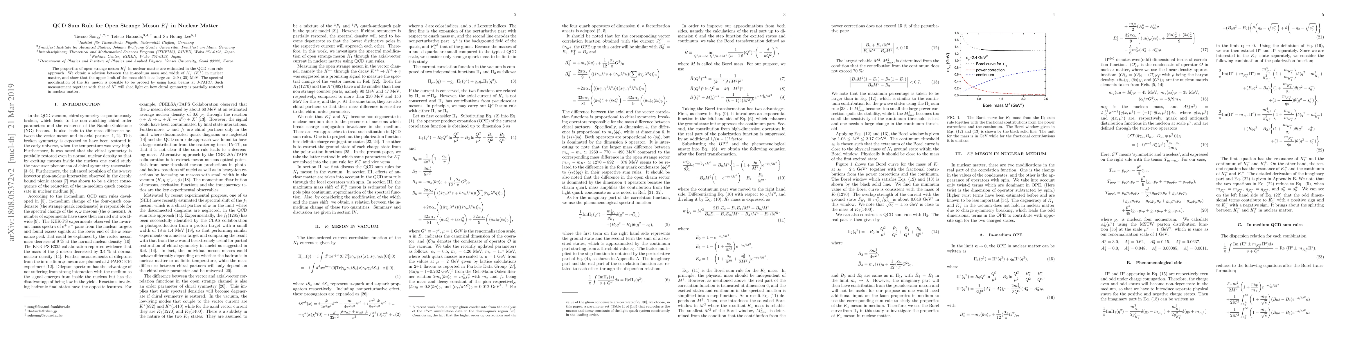 This paper uses the QCD sum rule approach to estimate the properties of the open strange meson $K_1^\pm$ in nuclear matter, finding a significant mass shift of up to -249 MeV for $K_1^-$ and -35 MeV for $K_1^+$. The study suggests that kaon beams at J-PARC can probe these spectral modifications, providing insights into chiral symmetry restoration in nuclear matter.