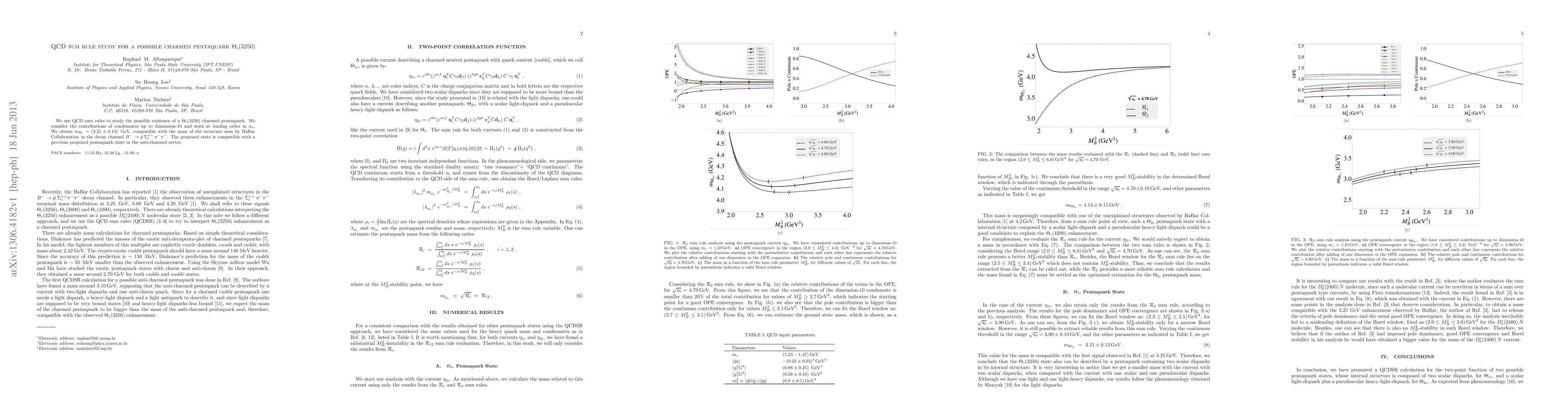 We use QCD sum rules to study the possible existence of a \Theta c(3250) charmed pentaquark. We consider the contributions of condensates up to dimension-10 and work at leading order in \alpha_s. We obtain m(\Theta c) = (3.21 +/- 0.13) GeV, compatible with the mass of the structure seen by BaBar Collaboration in the decay channel B- -> p- \Sigma c++ pi- pi-. The proposed state is compatible with a previous proposed pentaquark state in the anti-charmed sector.