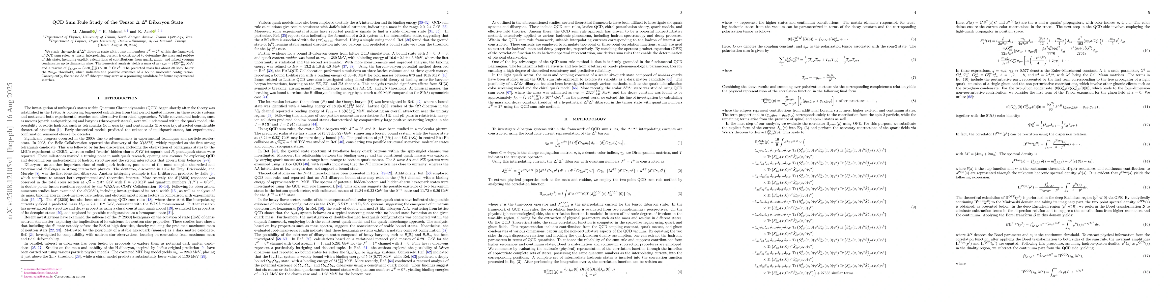 We study the exotic $\Delta^{0}\Delta^{0}$ dibaryon state with quantum numbers $J^{P} = 2^{+}$ within the framework of QCD sum rules. A tensor interpolating current is constructed to determine the mass and residue of this state, including explicit calculations of contributions from quark, gluon, and mixed vacuum condensates up to dimension nine. The numerical analysis yields a mass of $m_{\Delta^{0}\Delta^{0}} = 2426^{+101}_{-108}~\mathrm{MeV}$ and a residue of $f_{\Delta^{0}\Delta^{0}} = \left( 2.30^{+0.49}_{-0.45} \right) \times 10^{-4}~\mathrm{GeV}^{8}$. The predicted mass lies about $38~\mathrm{MeV}$ below the $2m_{\Delta^{0}}$ threshold, which indicates the possible existence of a bound molecular configuration. Consequently, the tensor $\Delta^{0}\Delta^{0}$ dibaryon may serve as a promising candidate for future experimental searches.