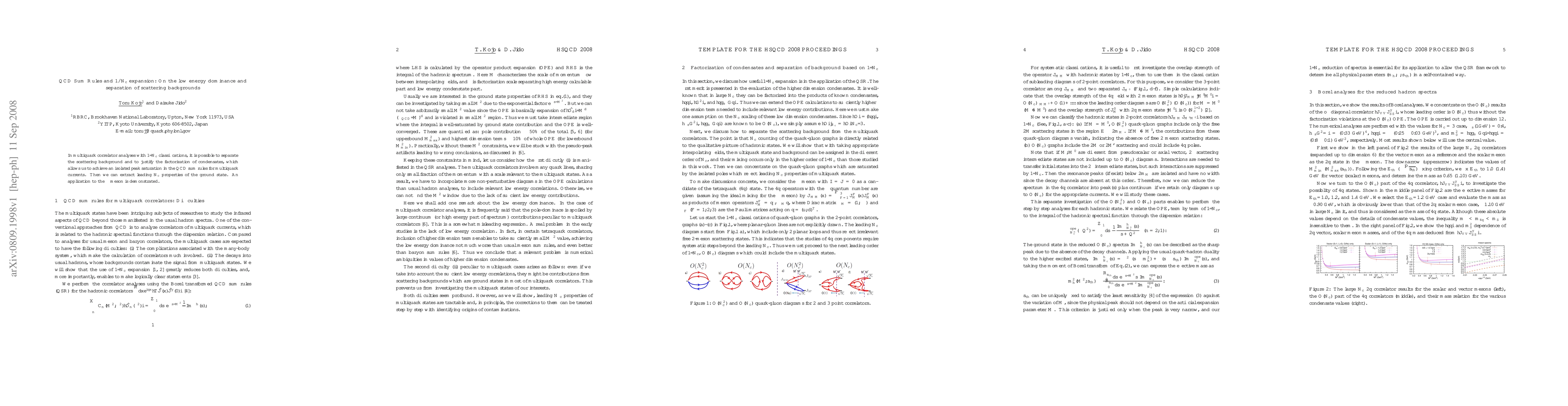 In multiquark correlator analyses with 1/Nc classifications, it is possible to separate the scattering background and to justify the factorization of condensates, which allows us to achieve an isolated peak saturation in the QCD sum rules for multiquark currents. Then we can extract leading Nc properties of the ground state. An application to the sigma meson is demonstrated.
