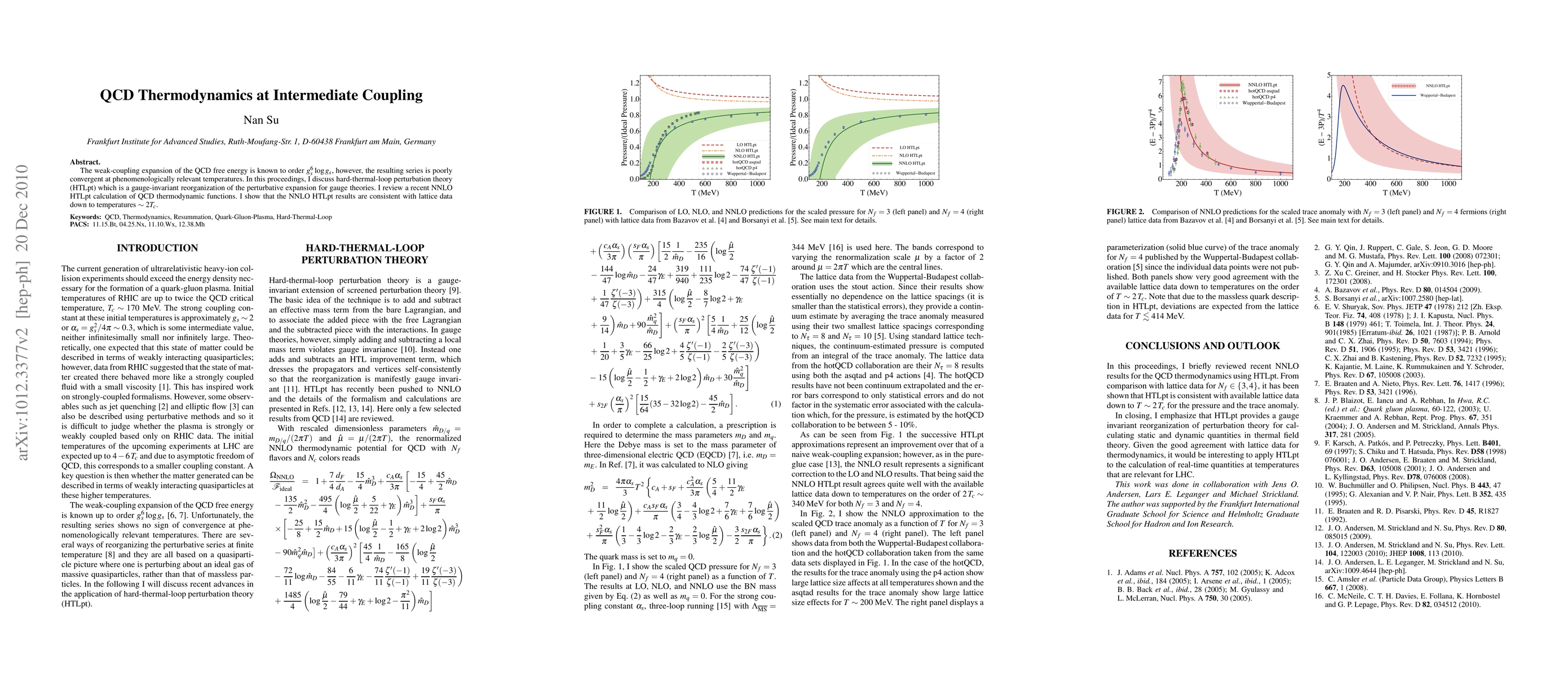 Title: QCD Thermodynamics at Intermediate Coupling Summary: This paper discusses hard-thermal-loop perturbation theory (HTLpt) for QCD thermodynamics, presenting NNLO HTLpt calculations that show consistent results with lattice data at temperatures down to ~2T_c, addressing the poor convergence of weak-coupling expansions.