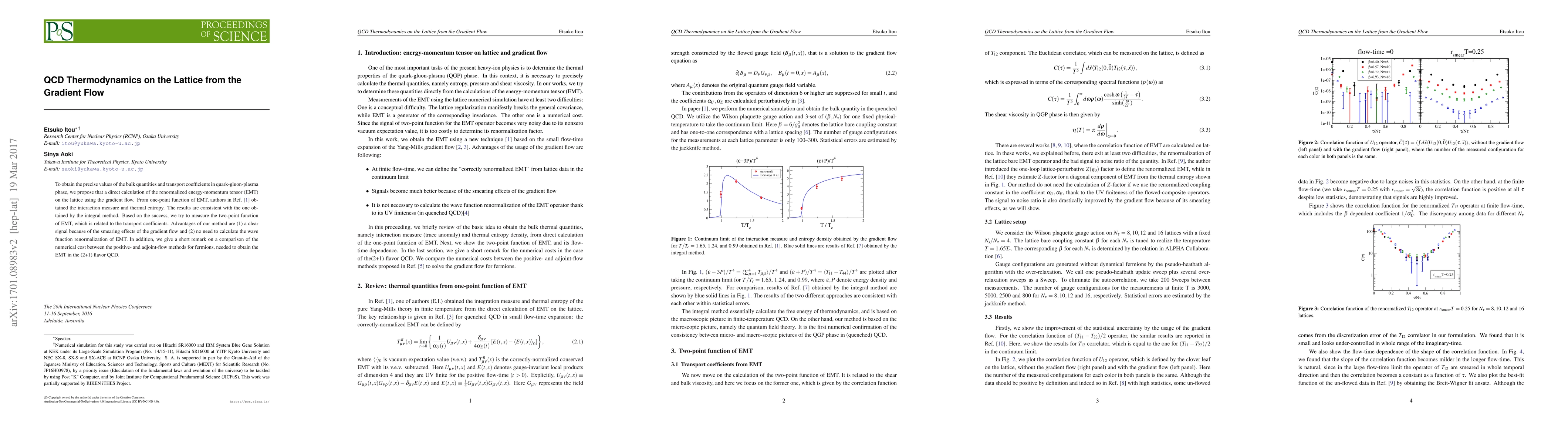 To obtain the precise values of the bulk quantities and transport coefficients in quark-gluon-plasma phase, we propose that a direct calculation of the renormalized energy-momentum tensor (EMT) on the lattice using the gradient flow. From one-point function of EMT, authors in Ref.[1] obtained the interaction measure and thermal entropy. The results are consistent with the one obtained by the integral method. Based on the success, we try to measure the two-point function of EMT, which is related to the transport coefficients. Advantages of our method are (1) a clear signal because of the smearing effects of the gradient flow and (2) no need to calculate the wave function renormalization of EMT. In addition, we give a short remark on a comparison of the numerical cost between the positive- and adjoint-flow methods for fermions, needed to obtain the EMT in the (2+1) flavor QCD.
