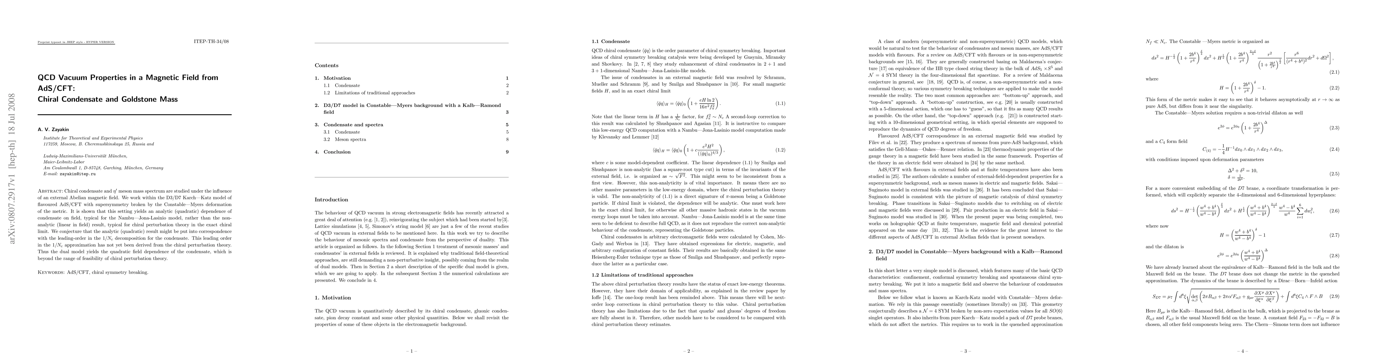This paper investigates the chiral condensate and $\eta^\prime$ meson mass in the presence of an external magnetic field using the D3/D7 Karch-Katz model in AdS/CFT. It finds a quadratic dependence of the chiral condensate on the magnetic field, contrasting with the linear dependence predicted by chiral perturbation theory.