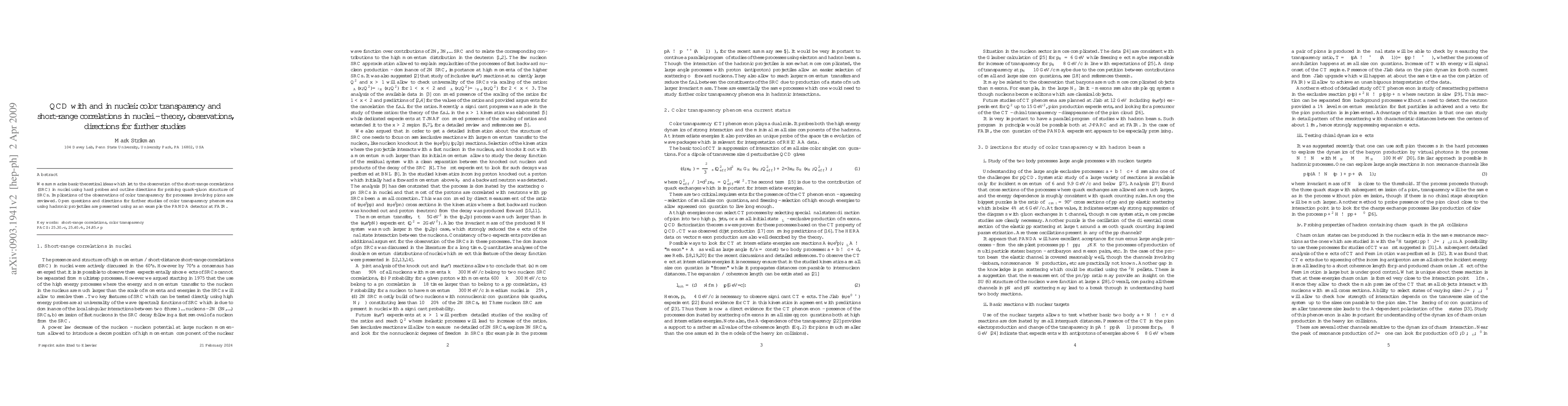 We summarize basic theoretical ideas which let to the observation of the short-range correlations (SRC) in nuclei using hard probes and outline directions for probing quark-gluon structure of SRCs. Implications of the observations of color transparency for processes involving pions are reviewed. Open questions and directions for further studies of color transparency phenomena using hadronic projectiles are presented using as an example the PANDA detector at FAIR.