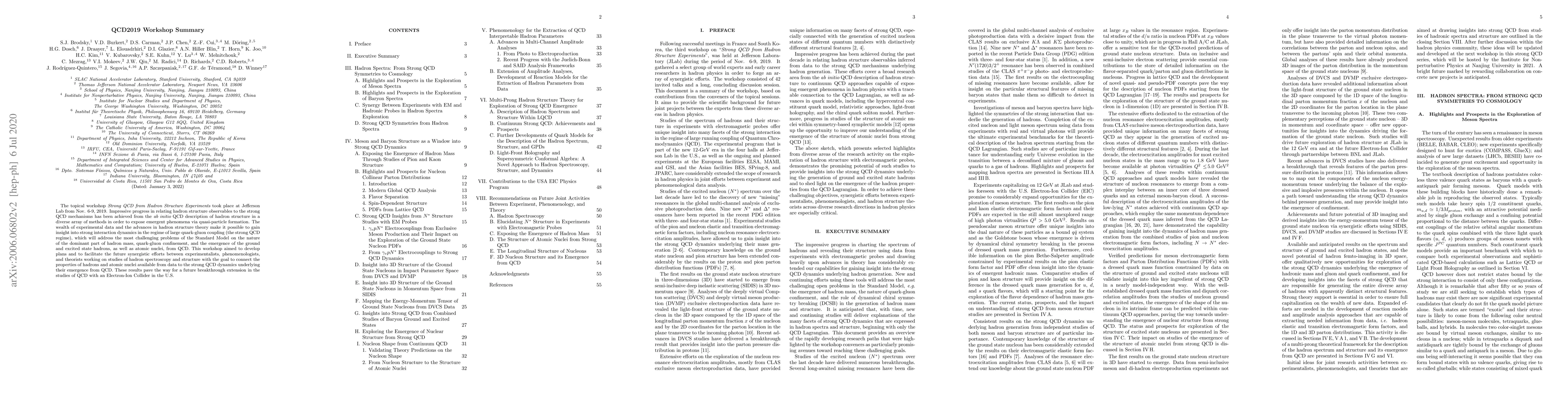 The topical workshop {\it Strong QCD from Hadron Structure Experiments} took place at Jefferson Lab from Nov. 6-9, 2019. Impressive progress in relating hadron structure observables to the strong QCD mechanisms has been achieved from the {\it ab initio} QCD description of hadron structure in a diverse array of methods in order to expose emergent phenomena via quasi-particle formation. The wealth of experimental data and the advances in hadron structure theory make it possible to gain insight into strong interaction dynamics in the regime of large quark-gluon coupling (the strong QCD regime), which will address the most challenging problems of the Standard Model on the nature of the dominant part of hadron mass, quark-gluon confinement, and the emergence of the ground and excited state hadrons, as well as atomic nuclei, from QCD. This workshop aimed to develop plans and to facilitate the future synergistic efforts between experimentalists, phenomenologists, and theorists working on studies of hadron spectroscopy and structure with the goal to connect the properties of hadrons and atomic nuclei available from data to the strong QCD dynamics underlying their emergence from QCD. These results pave the way for a future breakthrough extension in the studies of QCD with an Electron-Ion Collider in the U.S.