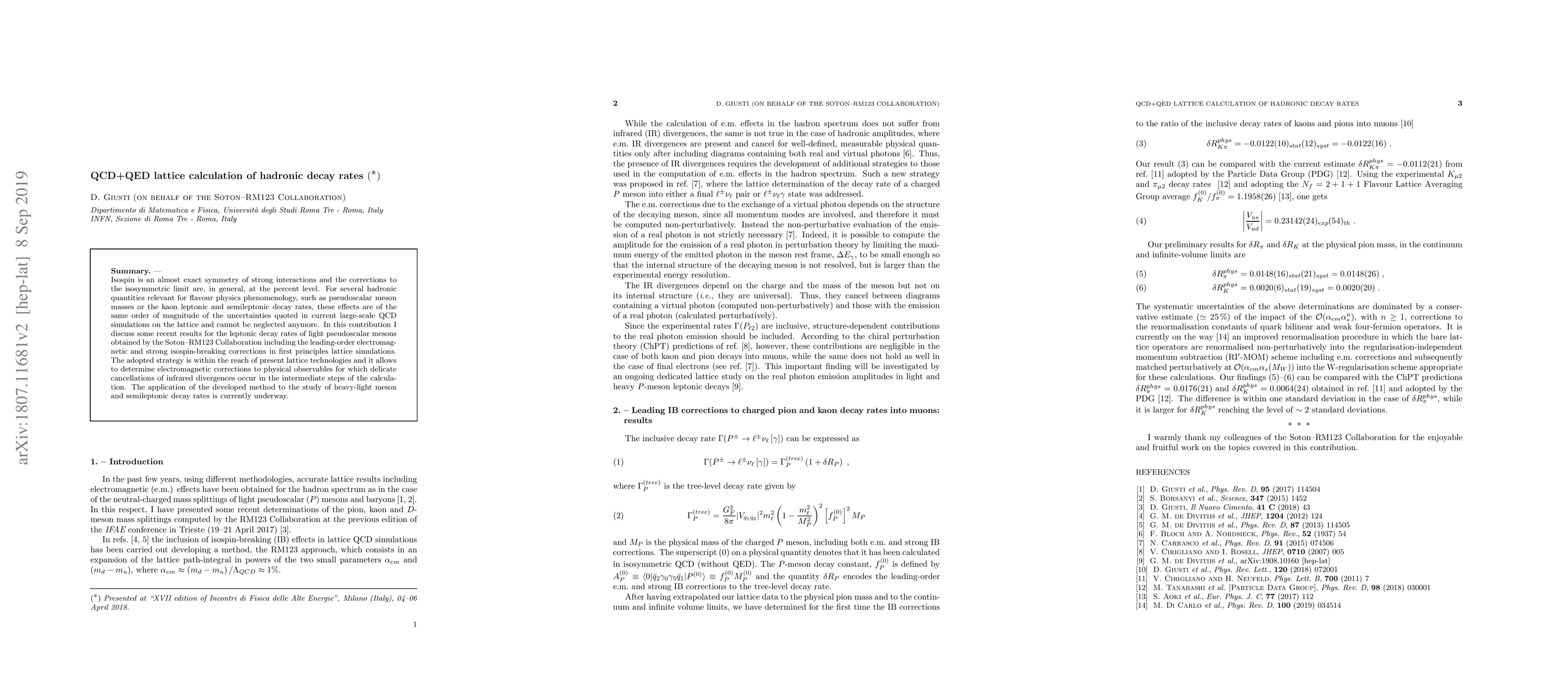 Isospin is an almost exact symmetry of strong interactions and the corrections to the isosymmetric limit are, in general, at the percent level. For several hadronic quantities relevant for flavour physics phenomenology, such as pseudoscalar meson masses or the kaon leptonic and semileptonic decay rates, these effects are of the same order of magnitude of the uncertainties quoted in current large-scale QCD simulations on the lattice and cannot be neglected anymore. In this contribution I discuss some recent results for the leptonic decay rates of light pseudoscalar mesons obtained by the Soton--RM123 Collaboration including the leading-order electromagnetic and strong isospin-breaking corrections in first principles lattice simulations. The adopted strategy is within the reach of present lattice technologies and it allows to determine electromagnetic corrections to physical observables for which delicate cancellations of infrared divergences occur in the intermediate steps of the calculation. The application of the developed method to the study of heavy-light meson and semileptonic decay rates is currently underway.