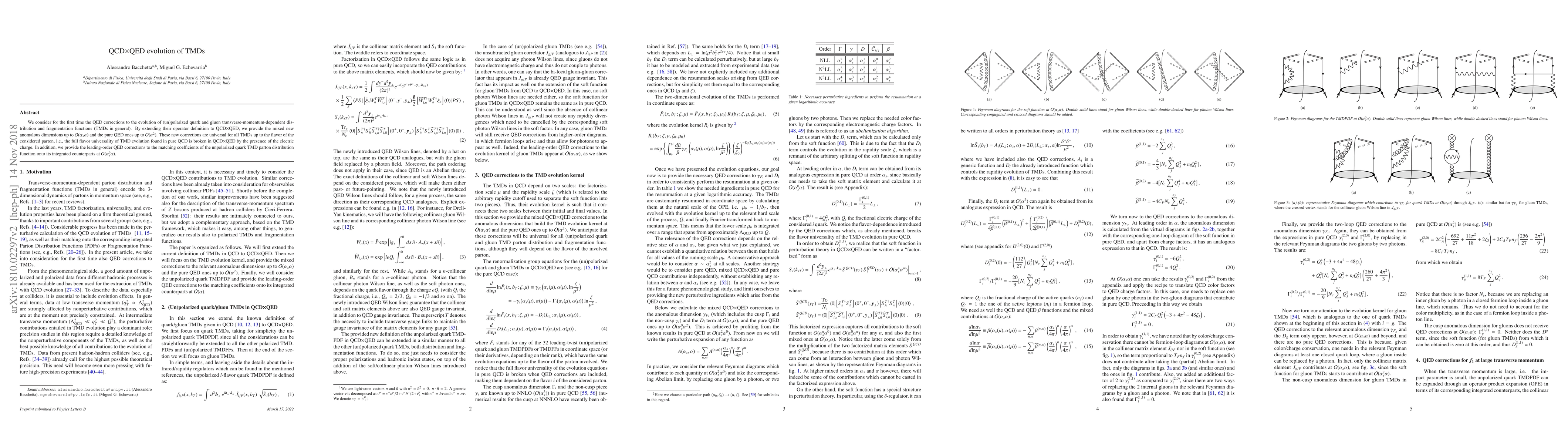 This paper investigates the first QED corrections to the evolution of unpolarized quark and gluon TMDs, providing new anomalous dimensions up to ${\cal O}(\alpha_s\alpha)$ and ${\cal O}(\alpha^2)$. It reveals that the full flavor universality in pure QCD is disrupted in QCD$\times$QED due to electric charge effects.