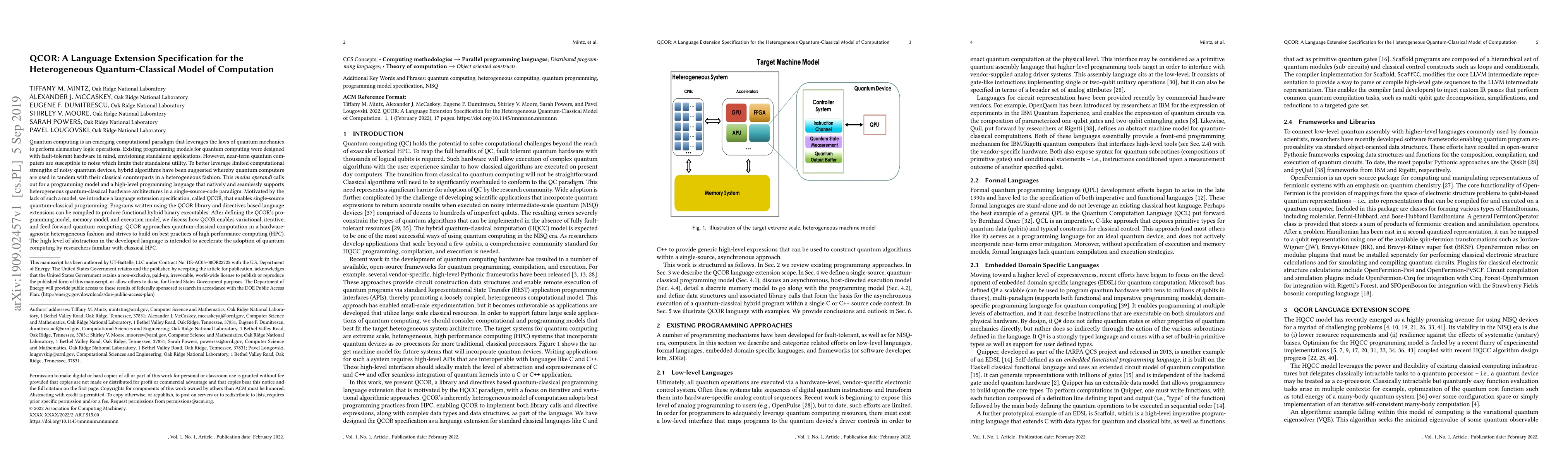 The paper introduces QCOR, a language extension specification for programming hybrid quantum-classical models, aiming to leverage noisy near-term quantum devices through a seamless, single-source-code paradigm. QCOR aims to accelerate quantum computing adoption by providing a high-level abstraction that aligns with classical high-performance computing practices.