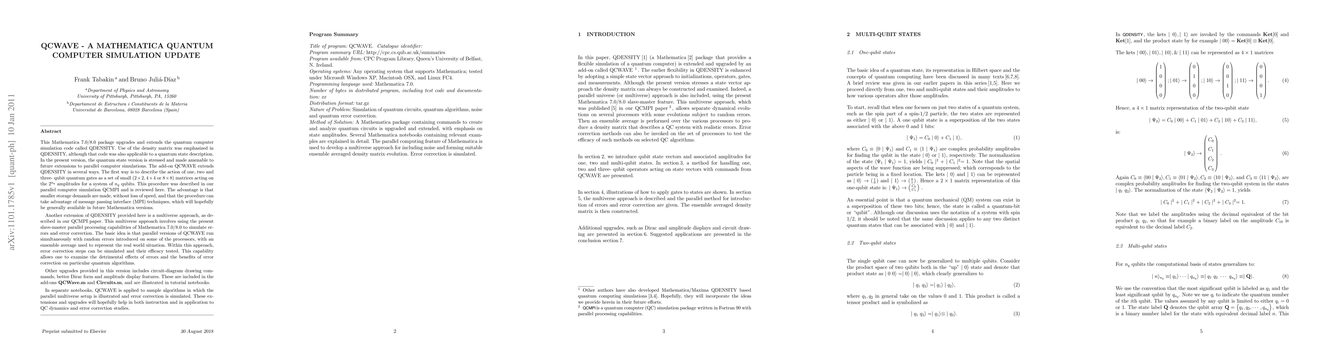 This Mathematica 7.0/8.0 package upgrades and extends the quantum computer simulation code called QDENSITY. Use of the density matrix was emphasized in QDENSITY, although that code was also applicable to a quantum state description. In the present version, the quantum state version is stressed and made amenable to future extensions to parallel computer simulations. The add-on QCWAVE extends QDENSITY in several ways. The first way is to describe the action of one, two and three- qubit quantum gates as a set of small ($2 \times 2, 4\times 4$ or $8\times 8$) matrices acting on the $2^{n_q}$ amplitudes for a system of $n_q$ qubits. This procedure was described in our parallel computer simulation QCMPI and is reviewed here. The advantage is that smaller storage demands are made, without loss of speed, and that the procedure can take advantage of message passing interface (MPI) techniques, which will hopefully be generally available in future Mathematica versions. Another extension of QDENSITY provided here is a multiverse approach, as described in our QCMPI paper. This multiverse approach involves using the present slave-master parallel processing capabilities of Mathematica 7.0/8.0 to simulate errors and error correction. The basic idea is that parallel versions of QCWAVE run simultaneously with random errors introduced on some of the processors, with an ensemble average used to represent the real world situation. Within this approach, error correction steps can be simulated and their efficacy tested. This capability allows one to examine the detrimental effects of errors and the benefits of error correction on particular quantum algorithms.