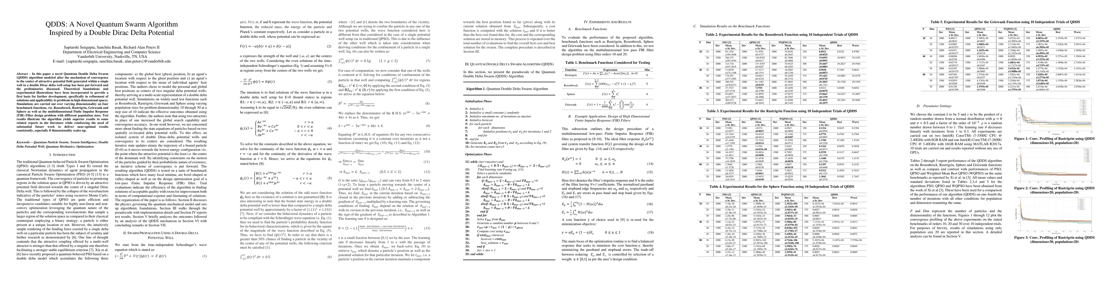 The paper introduces the Quantum Double Delta Swarm (QDDS) algorithm, inspired by the convergence mechanism in a double Dirac delta potential field. Initial simulations show superior performance on benchmark functions and FIR filter design, though further refinement is needed for consistent near-optimal results in high-dimensional problems.