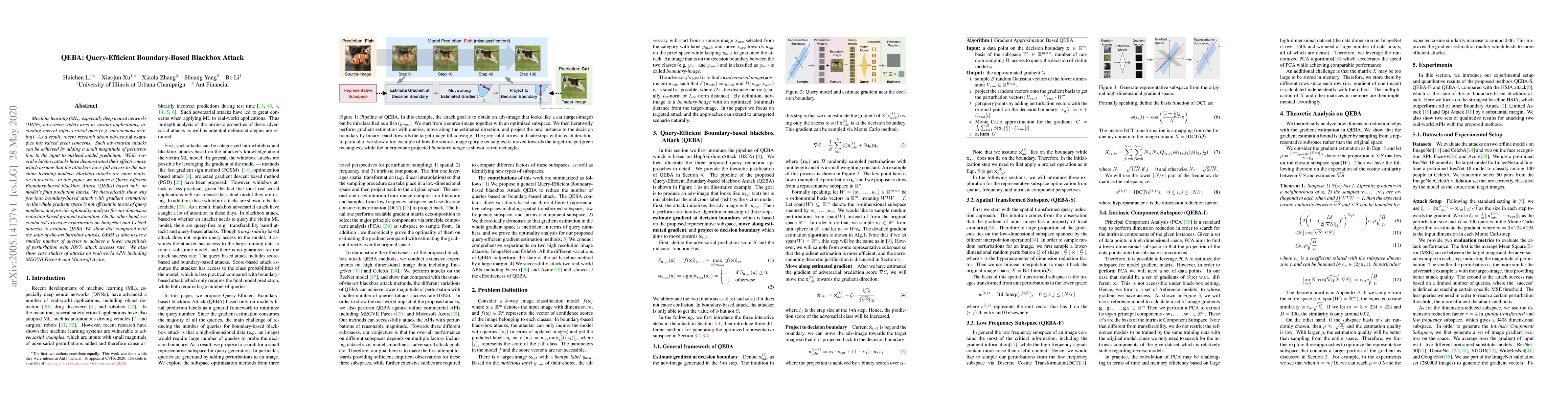 Machine learning (ML), especially deep neural networks (DNNs) have been widely used in various applications, including several safety-critical ones (e.g. autonomous driving). As a result, recent research about adversarial examples has raised great concerns. Such adversarial attacks can be achieved by adding a small magnitude of perturbation to the input to mislead model prediction. While several whitebox attacks have demonstrated their effectiveness, which assume that the attackers have full access to the machine learning models; blackbox attacks are more realistic in practice. In this paper, we propose a Query-Efficient Boundary-based blackbox Attack (QEBA) based only on model's final prediction labels. We theoretically show why previous boundary-based attack with gradient estimation on the whole gradient space is not efficient in terms of query numbers, and provide optimality analysis for our dimension reduction-based gradient estimation. On the other hand, we conducted extensive experiments on ImageNet and CelebA datasets to evaluate QEBA. We show that compared with the state-of-the-art blackbox attacks, QEBA is able to use a smaller number of queries to achieve a lower magnitude of perturbation with 100% attack success rate. We also show case studies of attacks on real-world APIs including MEGVII Face++ and Microsoft Azure.