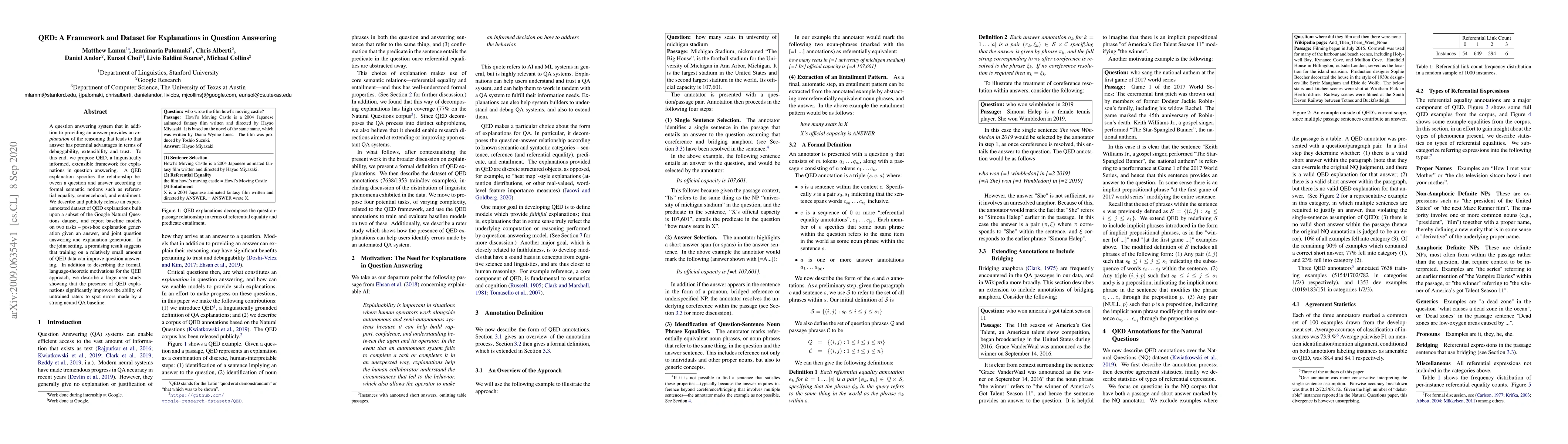 The paper introduces QED, a framework for generating explanations in question answering systems, emphasizing the benefits of debuggability, extensibility, and trust. It presents a dataset and baseline models for explanation generation, showing that QED explanations can improve error detection and suggest potential for enhancing question answering performance.