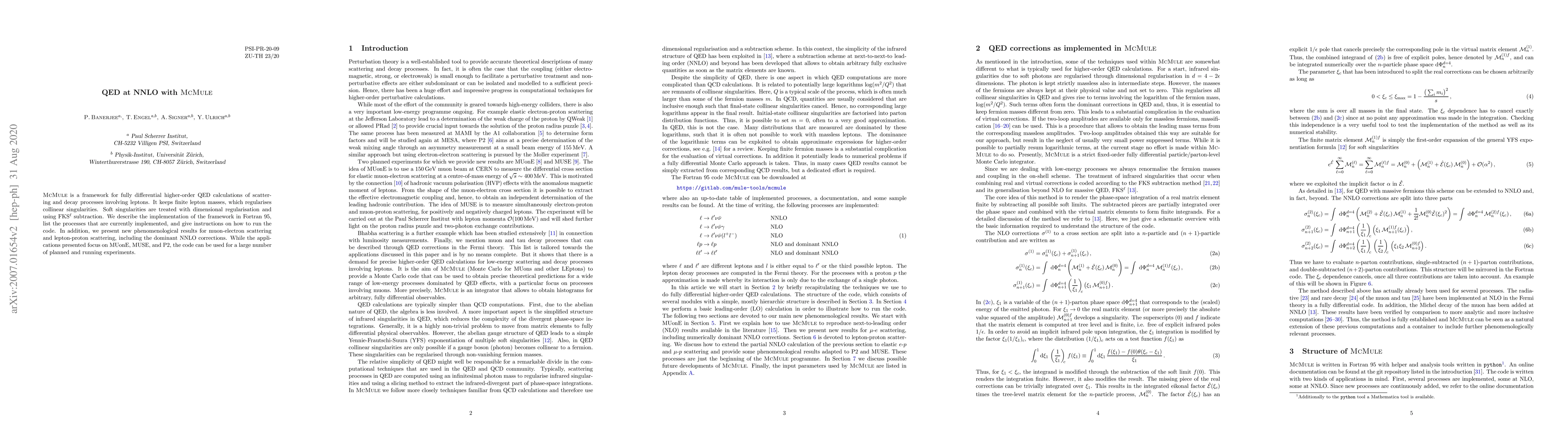 McMule is a Fortran 95 framework for higher-order QED calculations that handles finite lepton masses and NNLO corrections, providing new results for muon-electron and lepton-proton scattering. The code is versatile and applicable to various experiments beyond those initially presented.