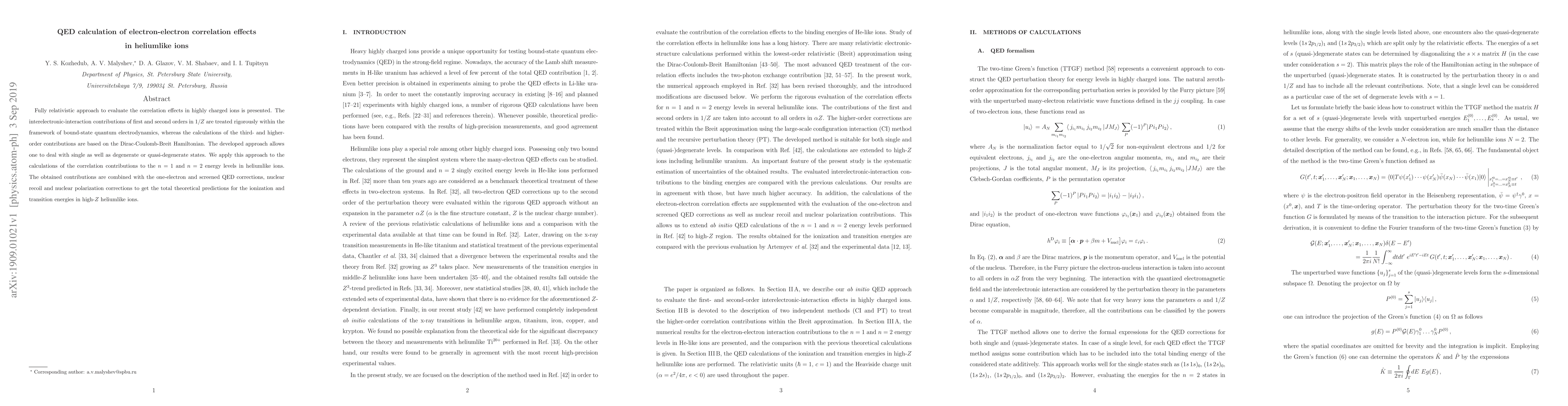 This paper presents a fully relativistic method to rigorously calculate electron-electron correlation effects in heliumlike ions using bound-state quantum electrodynamics for first and second-order interactions, and the Dirac-Coulomb-Breit Hamiltonian for higher orders. The results are applied to predict ionization and transition energies in high-$Z$ heliumlike ions.