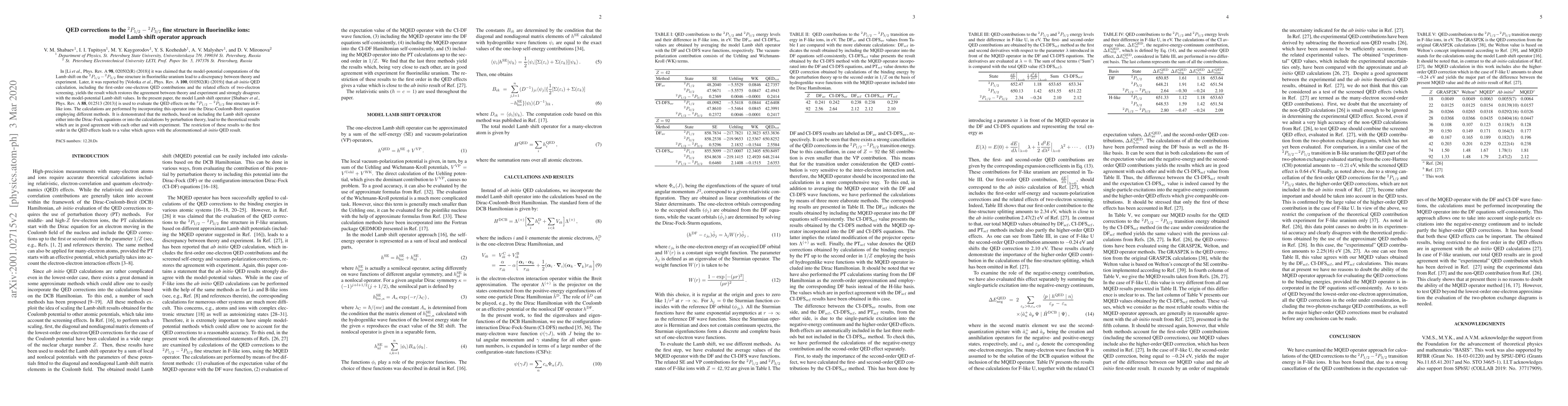 In [Li ${\it et \, al.}$, Phys. Rev. A ${\bf 98}$, 020502(R) (2018)] it was claimed that the model-potential computations of the Lamb shift on the $^2P_{1/2}-{}^2P_{3/2}$ fine structure in fluorinelike uranium lead to a discrepancy between theory and experiment. Later, it was reported by [Volotka ${\it et \, al.}$, Phys. Rev. A ${\bf 100}$, 010502(R) (2019)] that {\it ab initio} QED calculation, including the first-order one-electron QED contributions and the related effects of two-electron screening, yields the result which restores the agreement between theory and experiment and strongly disagrees with the model-potential Lamb shift values. In the present paper, the model Lamb shift operator [Shabaev ${\it et \, al.}$, Phys. Rev. A ${\bf 88}$, 012513 (2013)] is used to evaluate the QED effects on the $^2P_{1/2}-{}^2P_{3/2}$ fine structure in F-like ions. The calculations are performed by incorporating this operator into the Dirac-Coulomb-Breit equation employing different methods. It is demonstrated that the methods, based on including the Lamb shift operator either into the Dirac-Fock equations or into the calculations by perturbation theory, lead to the theoretical results which are in good agreement with each other and with experiment. The restriction of these results to the first order in the QED effects leads to a value which agrees with the aforementioned ${\it ab\, initio}$ QED result.