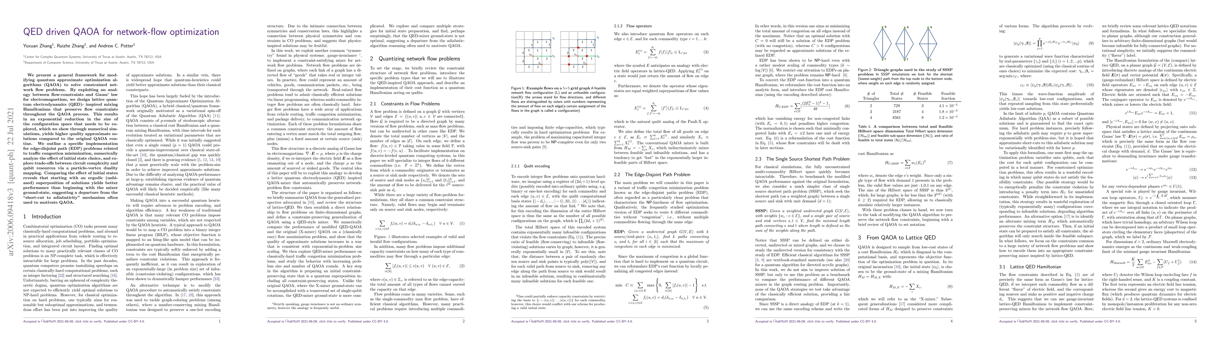 We present a general framework for modifying quantum approximate optimization algorithms (QAOA) to solve constrained network flow problems. By exploiting an analogy between flow constraints and Gauss's law for electromagnetism, we design lattice quantum electrodynamics (QED) inspired mixing Hamiltonians that preserve flow constraints throughout the QAOA process. This results in an exponential reduction in the size of the configuration space that needs to be explored, which we show through numerical simulations, yields higher quality approximate solutions compared to the original QAOA routine. We outline a specific implementation for edge-disjoint path (EDP) problems related to traffic congestion minimization, numerically analyze the effect of initial state choice, and explore trade-offs between circuit complexity and qubit resources via a particle-vortex duality mapping. Comparing the effect of initial states reveals that starting with an ergodic (unbiased) superposition of solutions yields better performance than beginning with the mixer ground-state, suggesting a departure from the "short-cut to adiabaticity" mechanism often used to motivate QAOA.