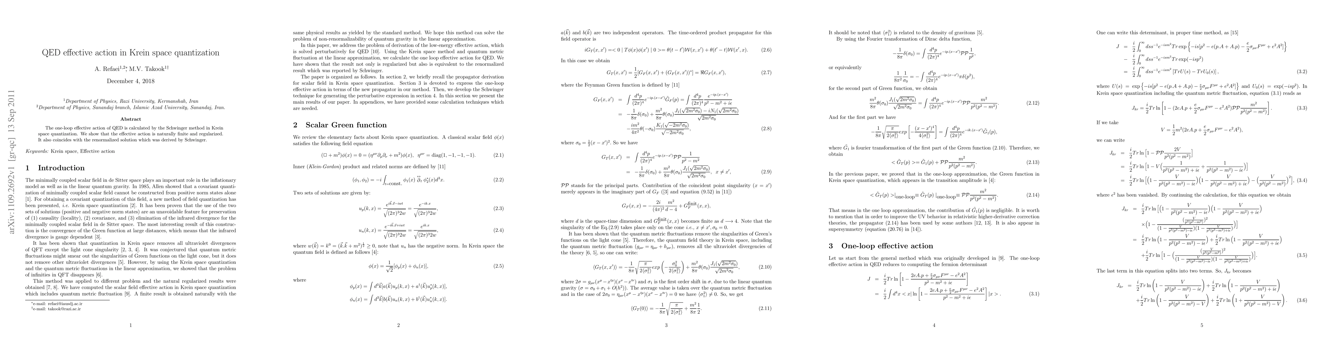 This paper calculates the one-loop effective action of Quantum Electrodynamics (QED) using the Schwinger method in Krein space quantization, demonstrating that the effective action is naturally finite and regularized, aligning with Schwinger's renormalized solution.