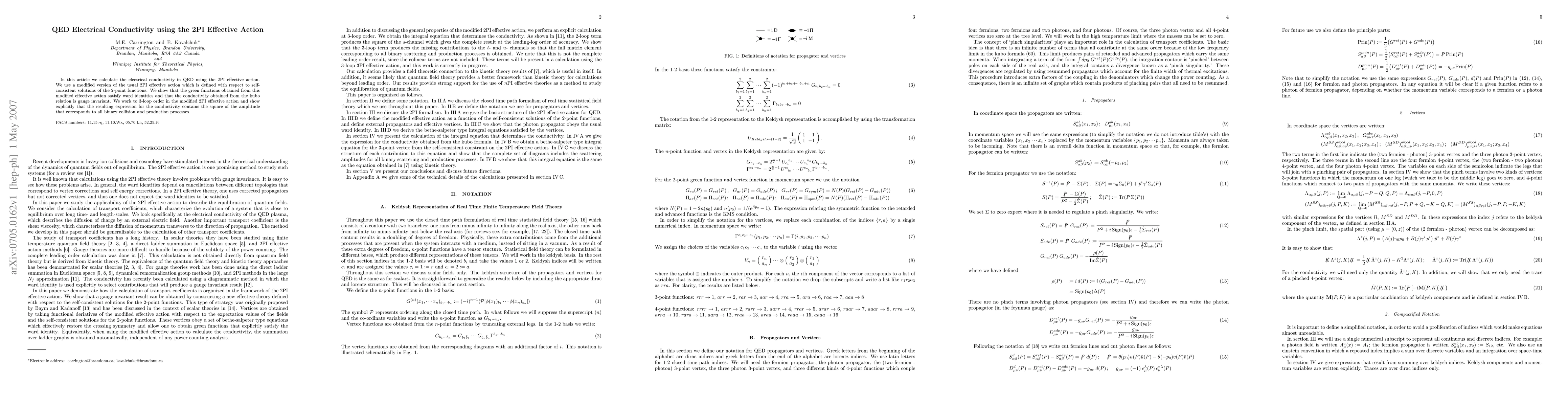This paper calculates the electrical conductivity in Quantum Electrodynamics (QED) using a modified 2PI effective action, demonstrating gauge invariance and satisfying Ward identities. The conductivity expression derived at 3-loop order includes contributions from all binary collision and production processes.